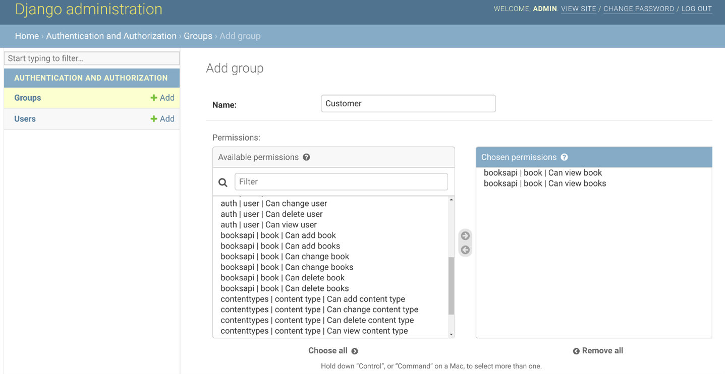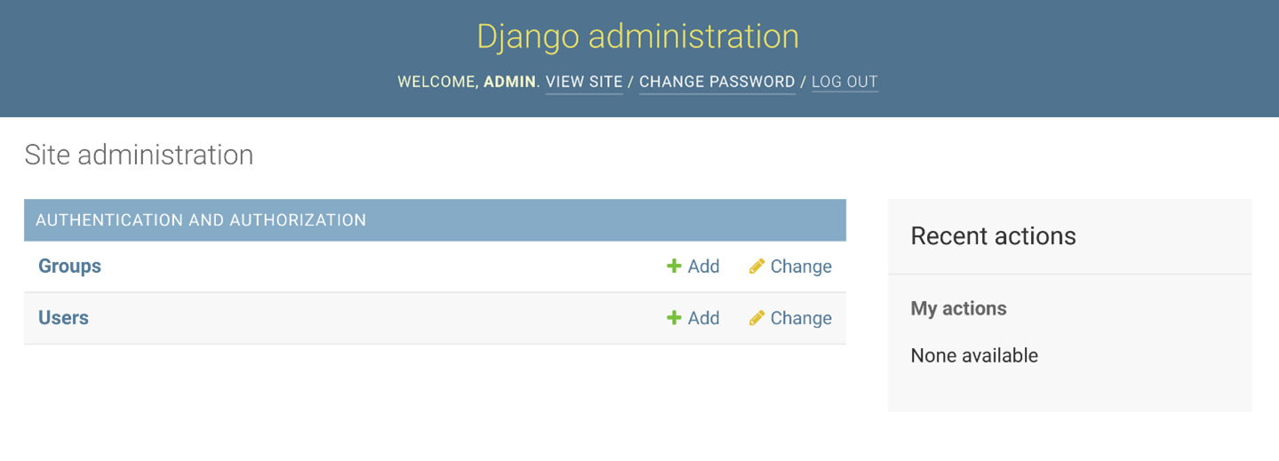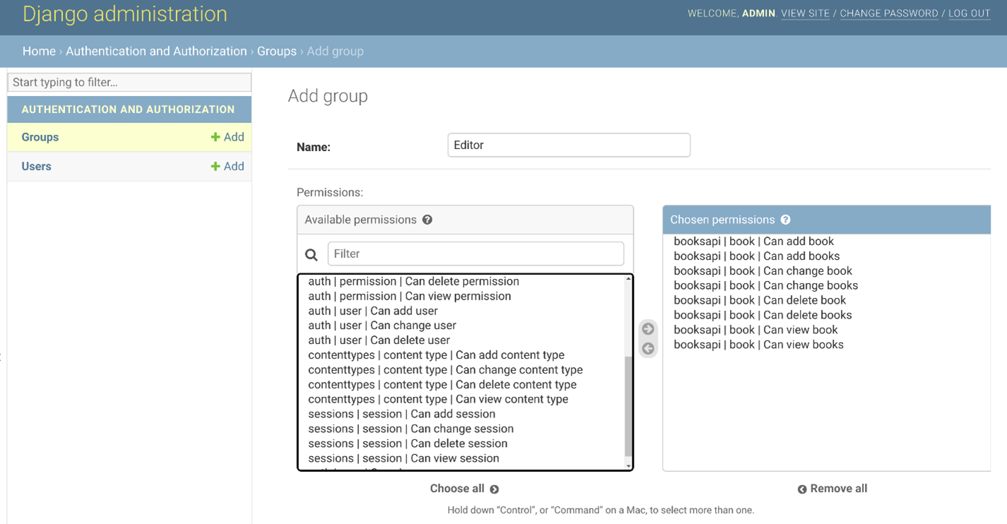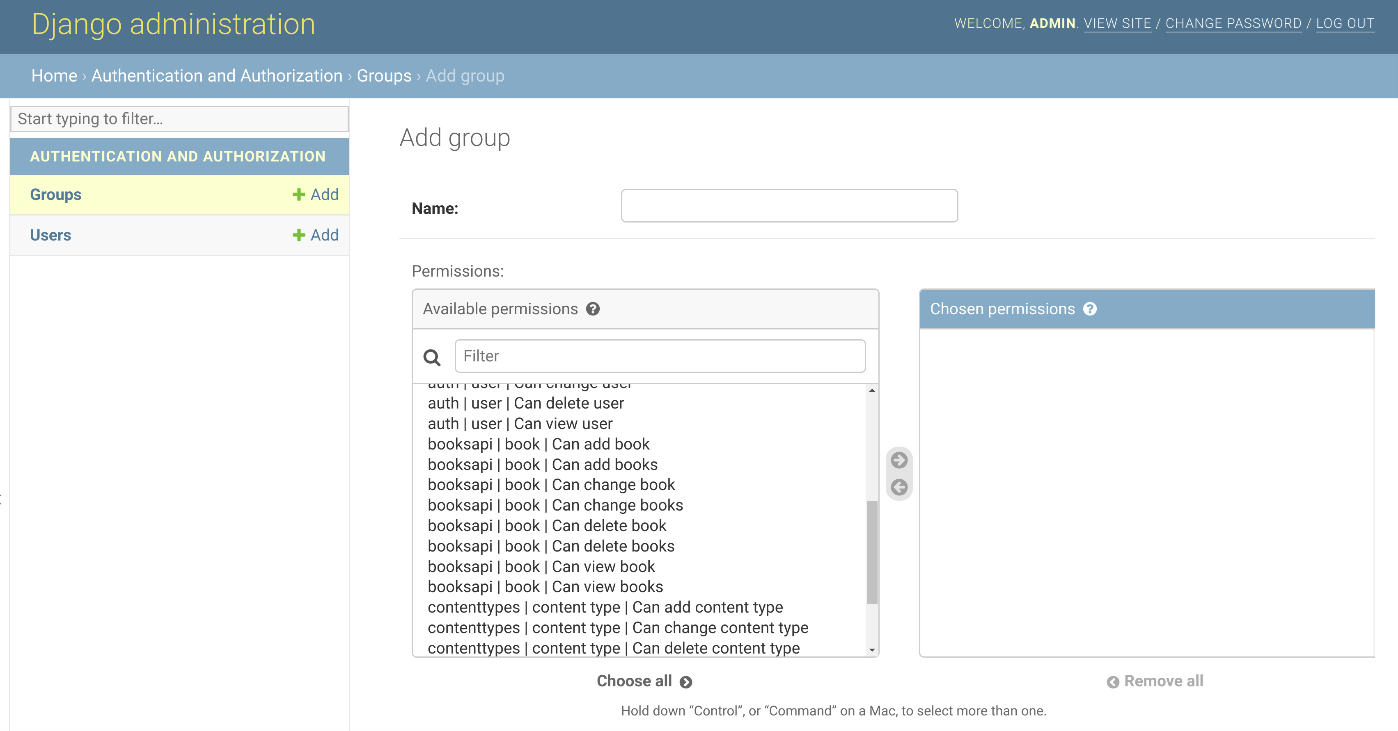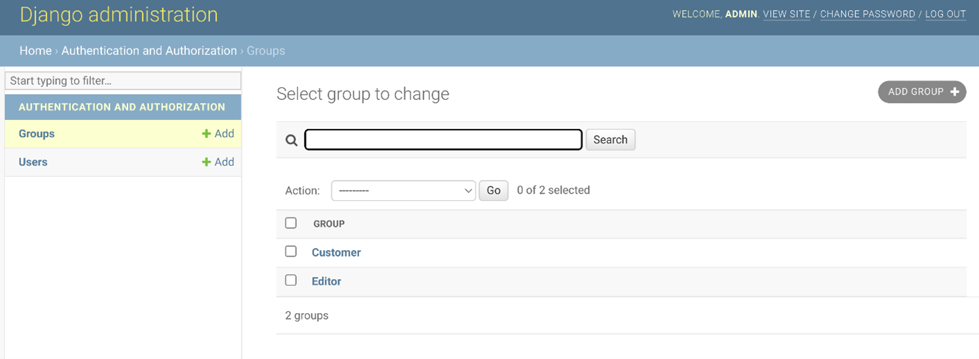 The Django admin panel comes with excellent support for the user group system. If you log into the admin panel, you will find two distinct sections – users and groups.