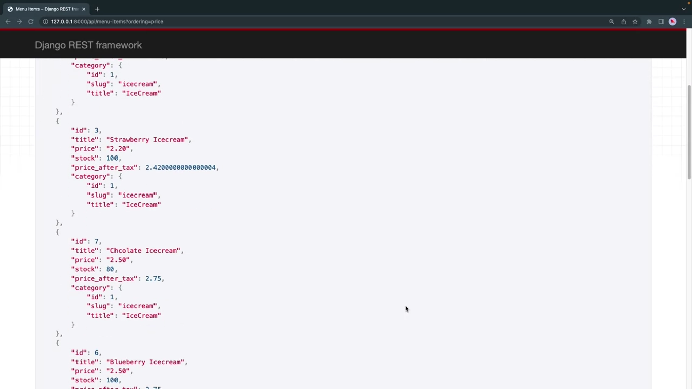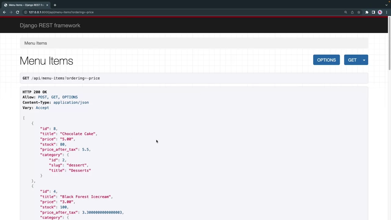 After the implementation is done, menu items can be sorted using this query string with the menu items endpoint http://127.0.0.1:8000/api/menu-items? ordering=price.