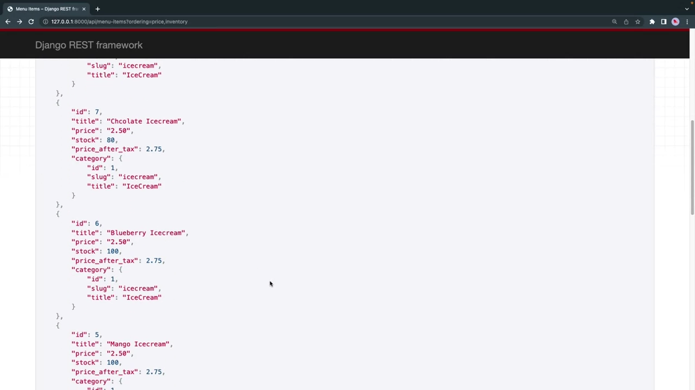 You can click on any of these options to sort the /api/menu-items API output by order and inventory in ascending or descending order. You can also sort the output by both fields by using ordering=price,inventory query string, like this: http://127.0.0.1:8000/api/menu-items?ordering=price,inventory.