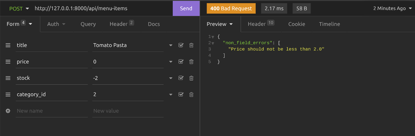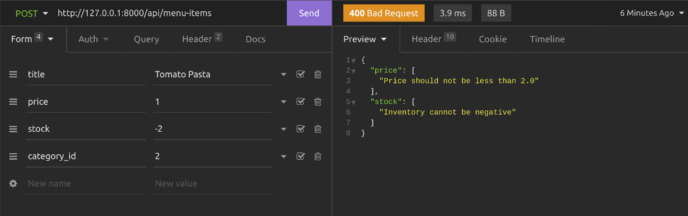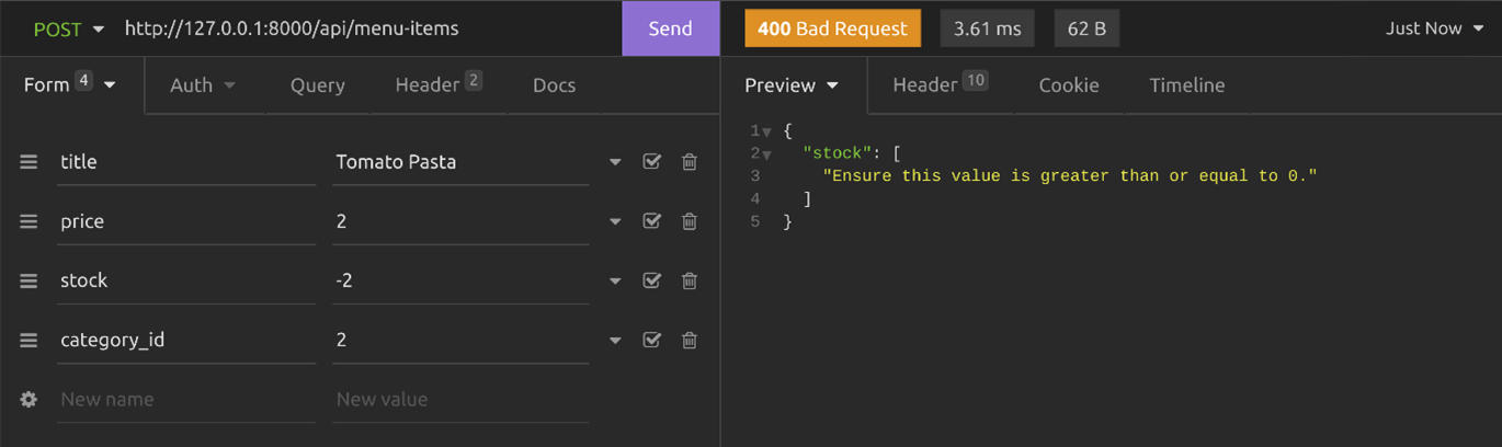 Validation is the process of ensuring that user-submitted data is in the correct format, meets the requirements and is safe to add to the database. The serializers in DRF provide different features which you can use to validate these data while building your APIs. Before jumping into the details let’s examine some user inputs while adding or modifying the menu items in the Little Lemon API project and how they should be validated.