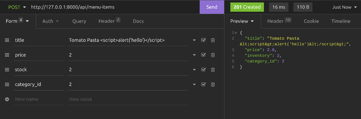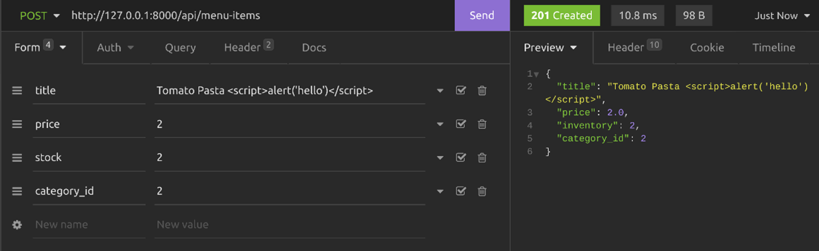 When a client application makes an HTTP call to the menu items endpoint, it will display all items along with their categories.
