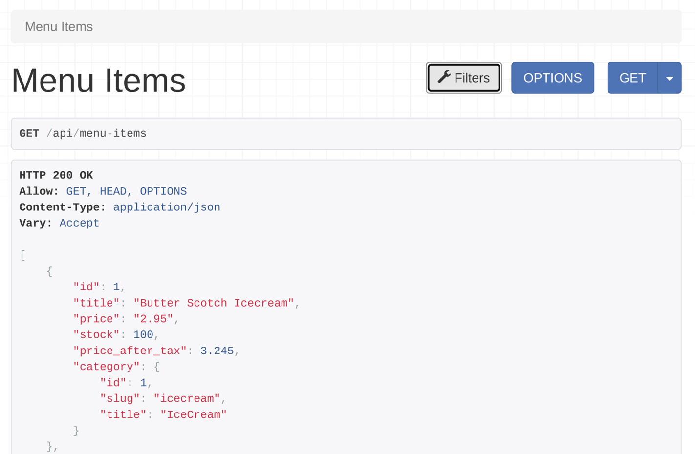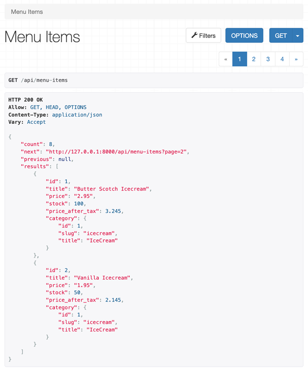 'PAGE_SIZE': 2The PAGE_SIZE property tells DRF how many items to show per page. Now if you were to visit the menu items endpoint you’d notice how the output has been paginated in the browsable API interface, and how the output data format has changed. Under the filter button, there are page numbers as well. Only two records per page show because that’s the setting in the settings.py file.