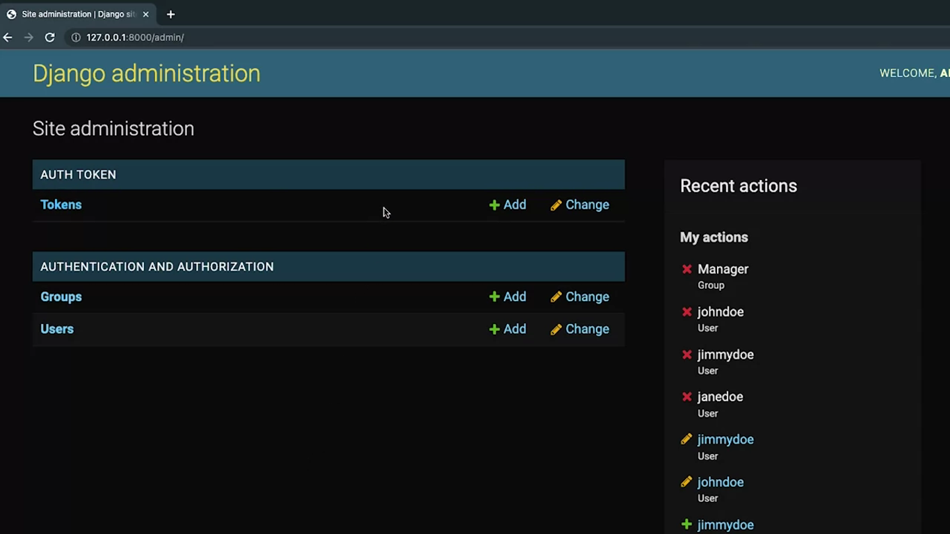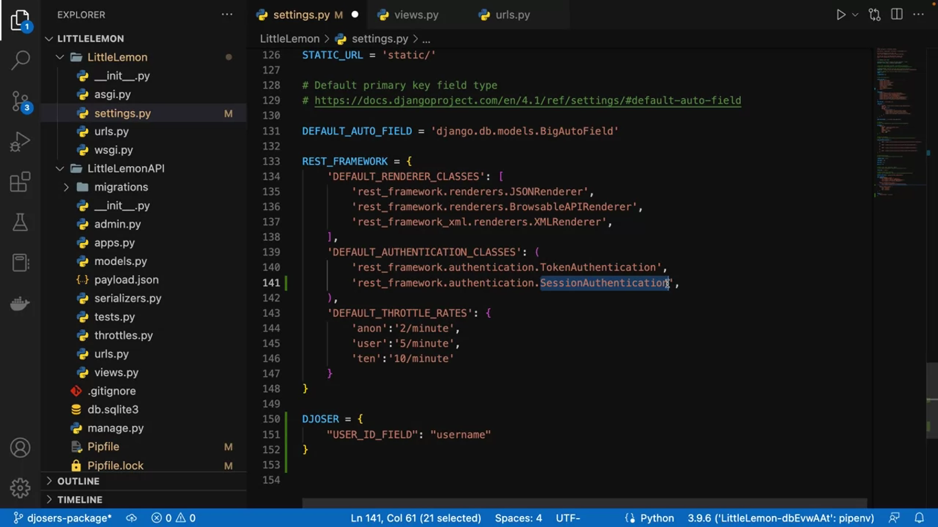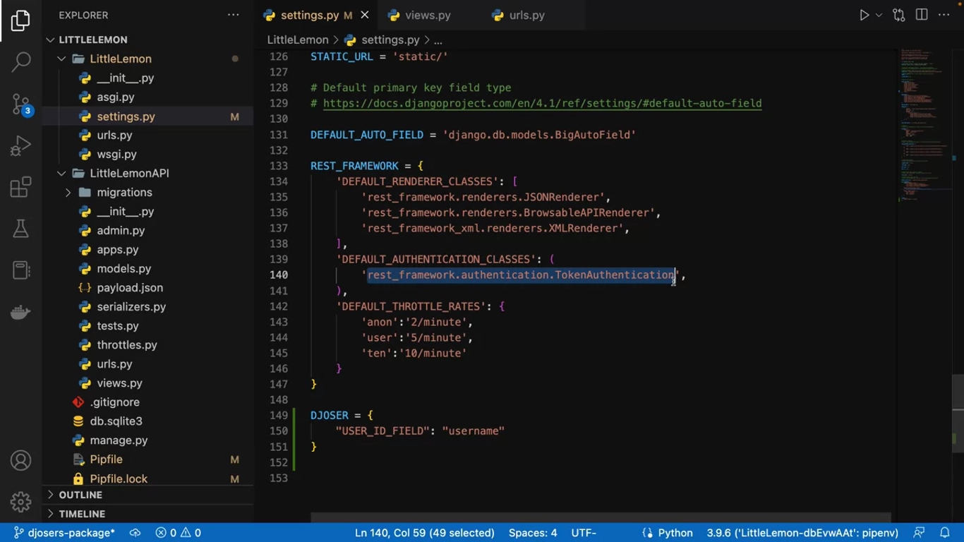 DEFAULT_AUTHENTICATION_CLASSESand assign a list to it containing the following items:rest_framework.authentication.TokenAuthenticationrest_framework.authentication.SessionAuthentication