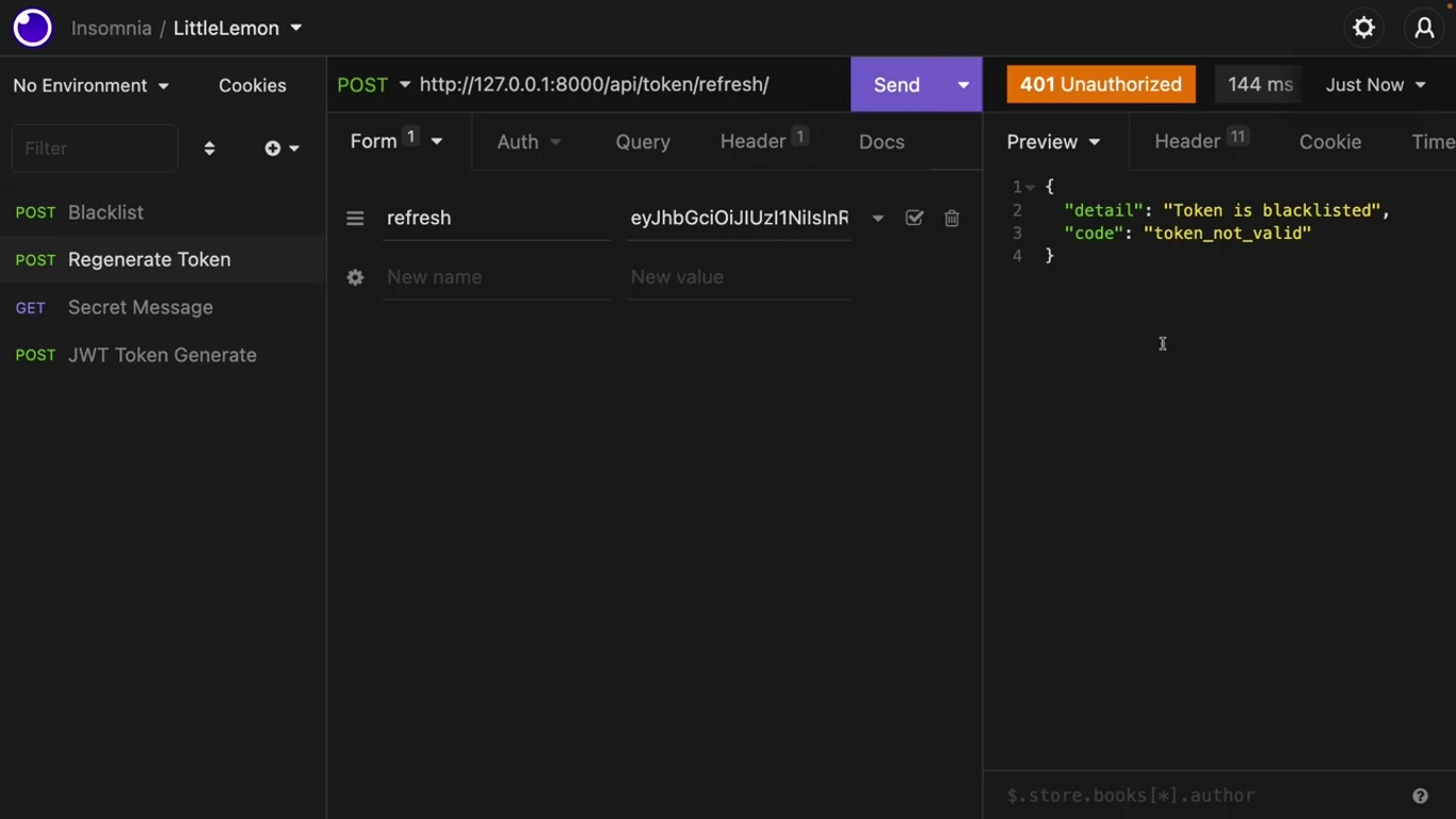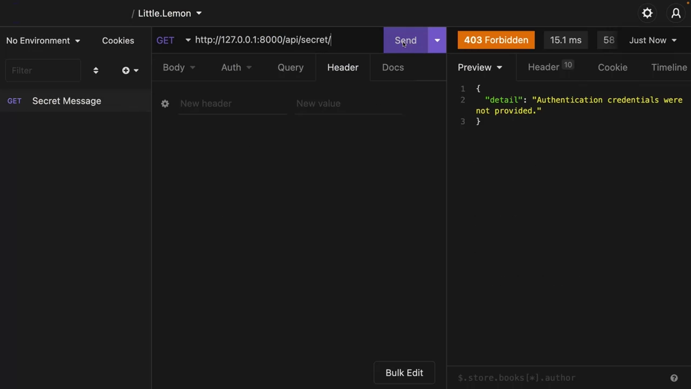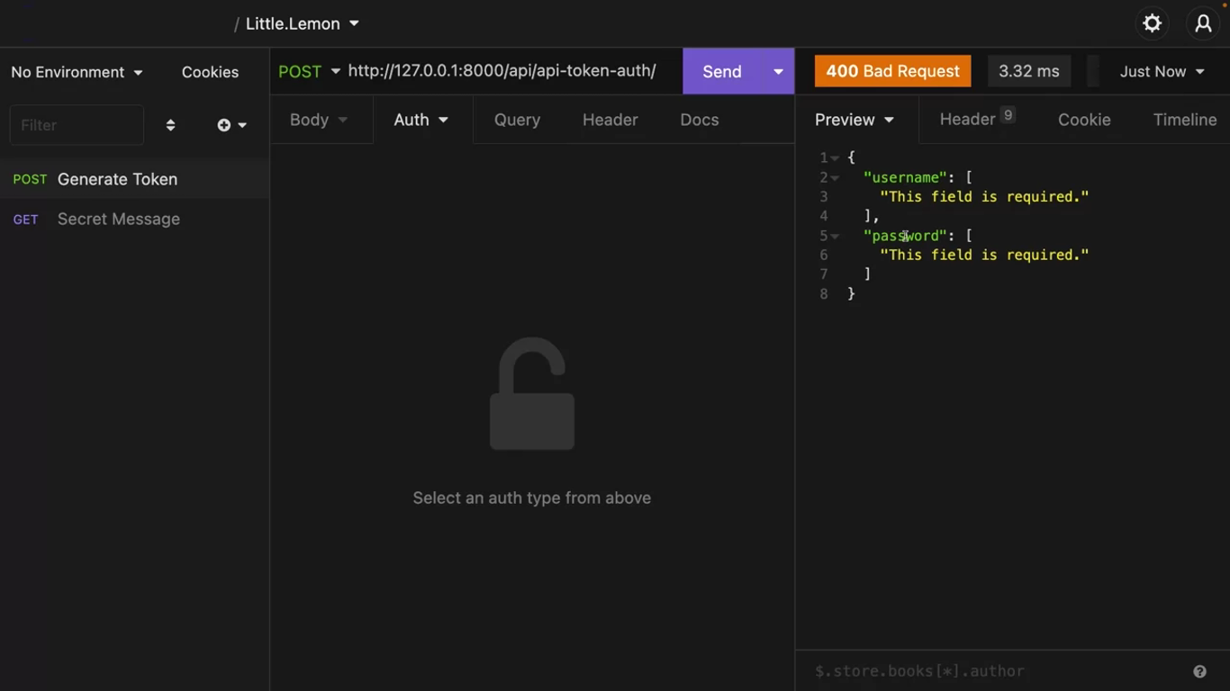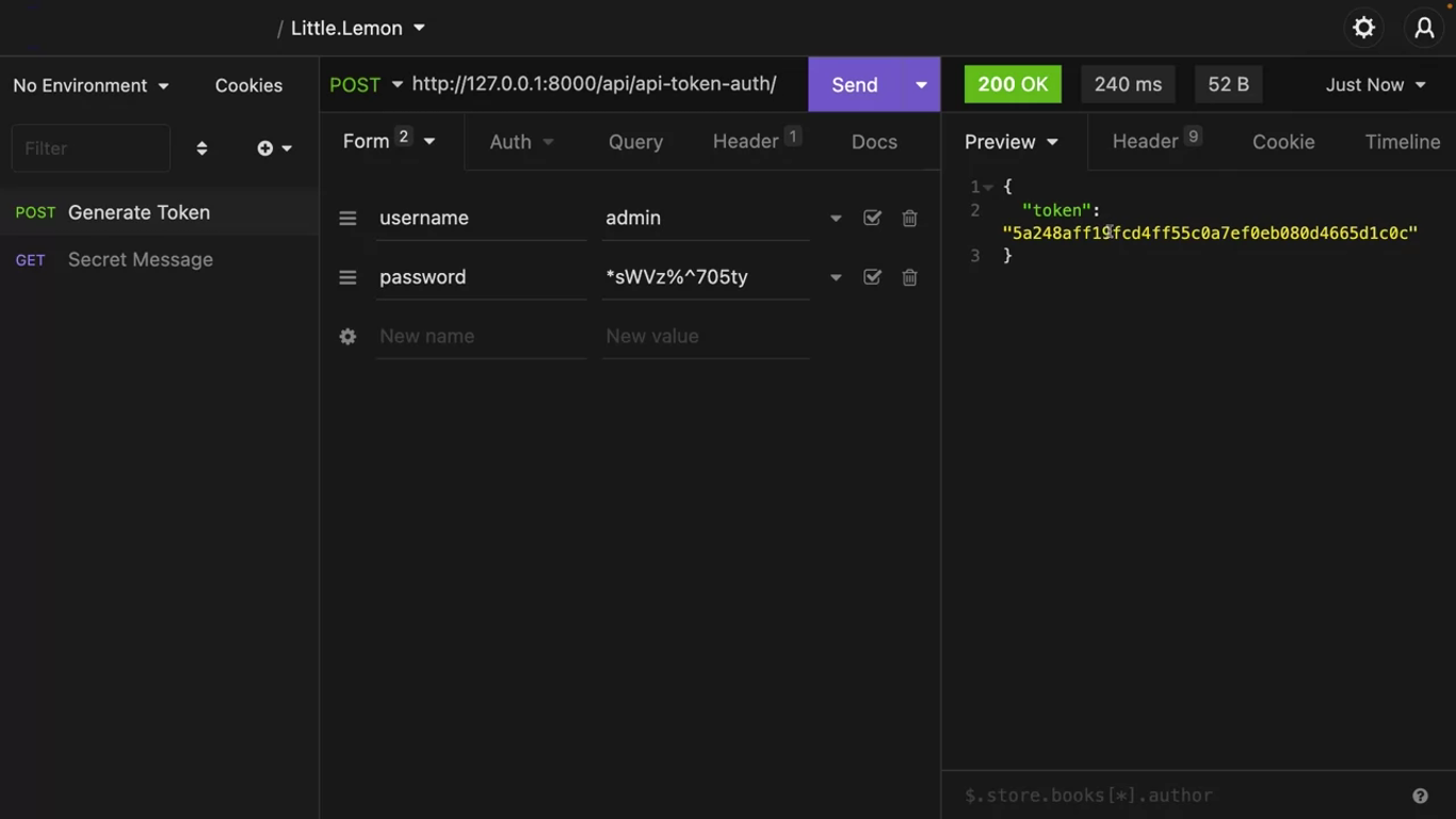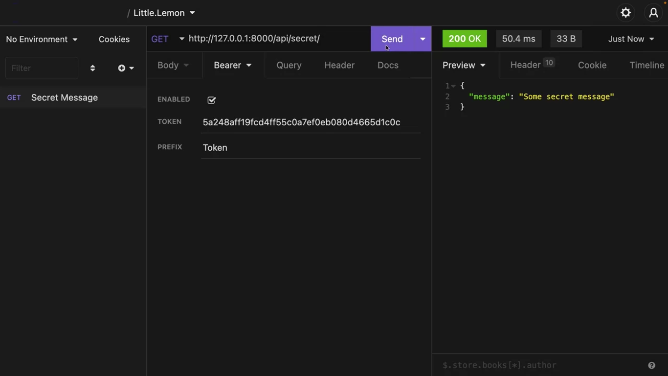 return Response({"message":"Some secret message"})Add path('secret/', views.secret) in the urls.py.