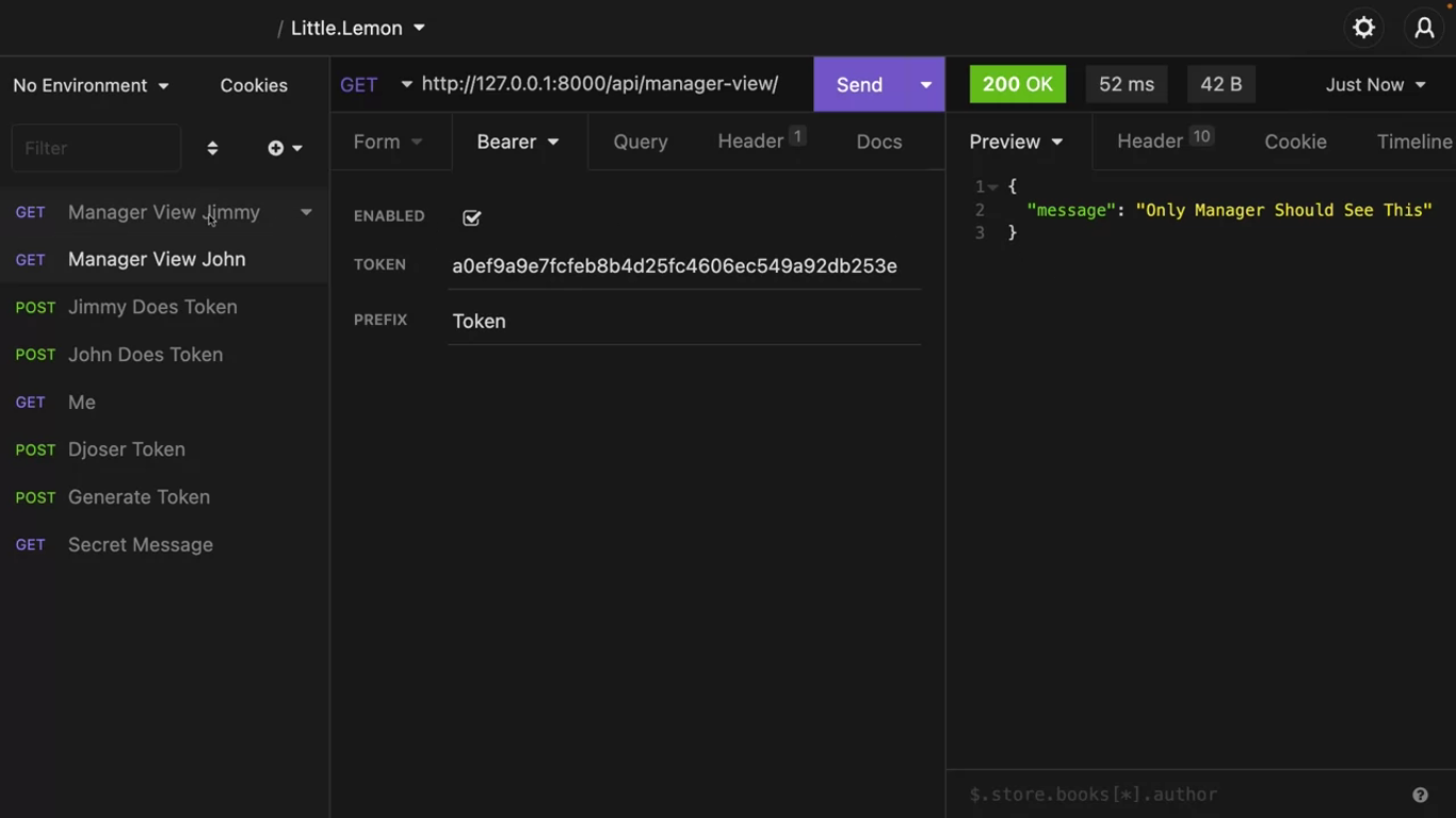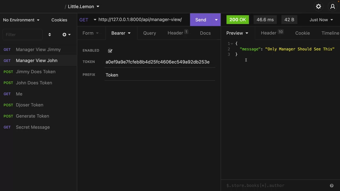 return Response({"manager": "Only Manager Should See This"})Add path('manager-view/', views.manager_view in the urls.py.