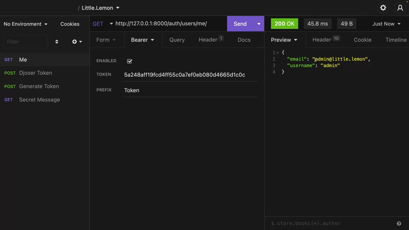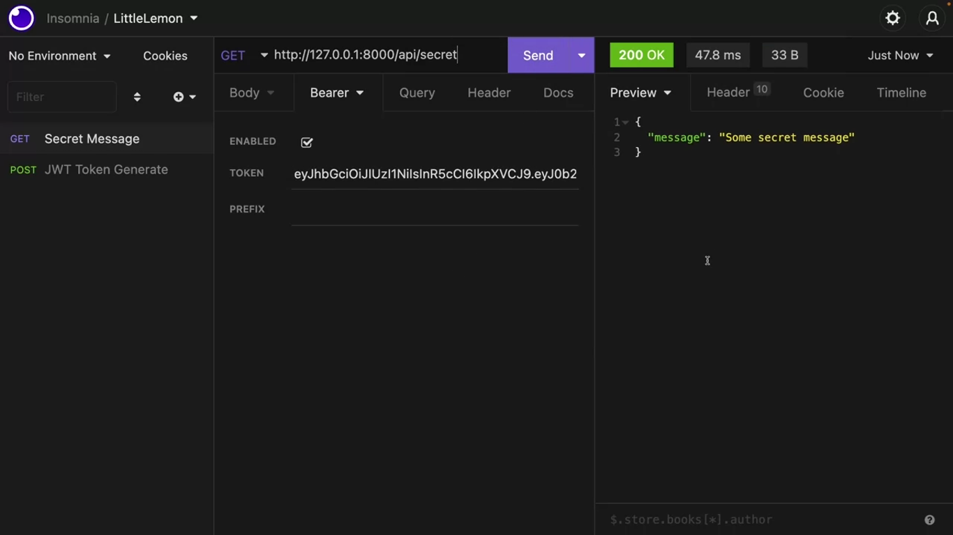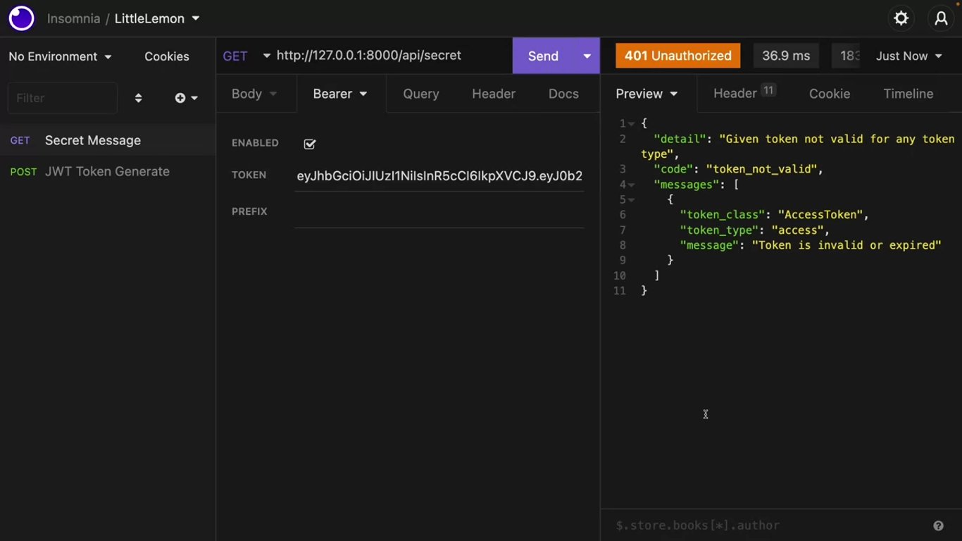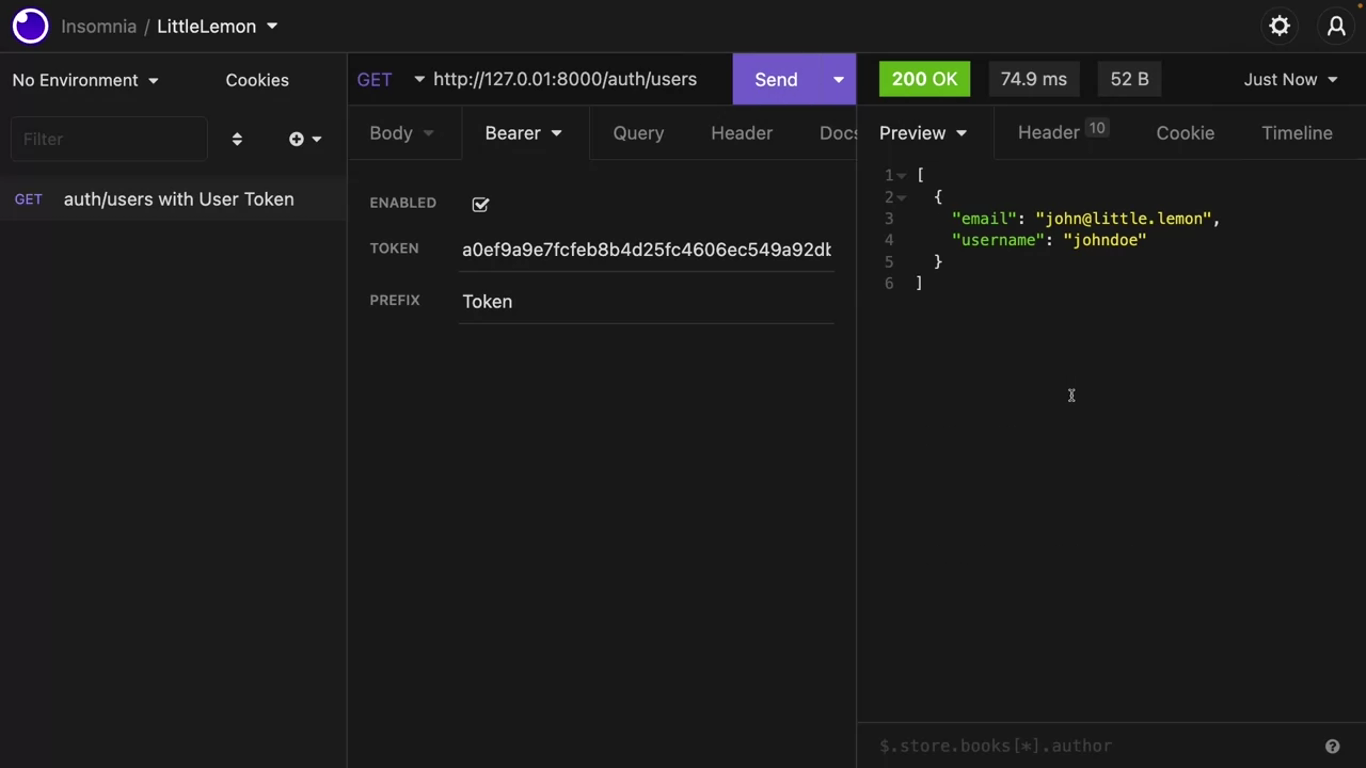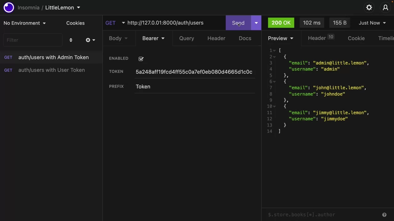 Come back to insomnia and click on the “Auth” tab next to body and select bearer token. Paste the token you just copied in the token field and right token and the prefix field.