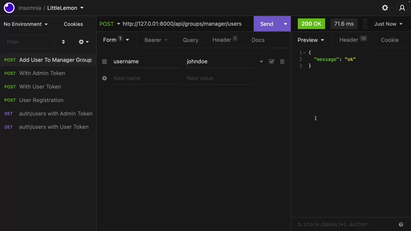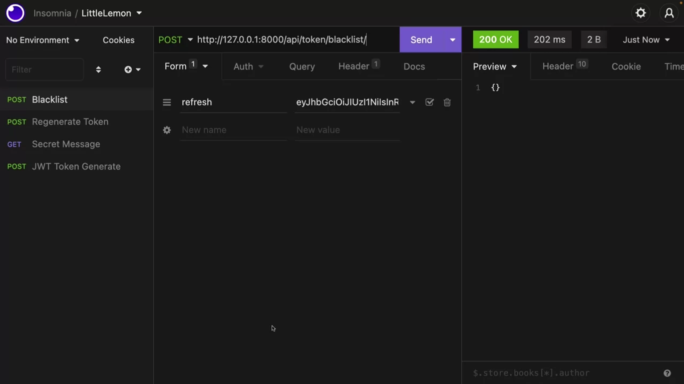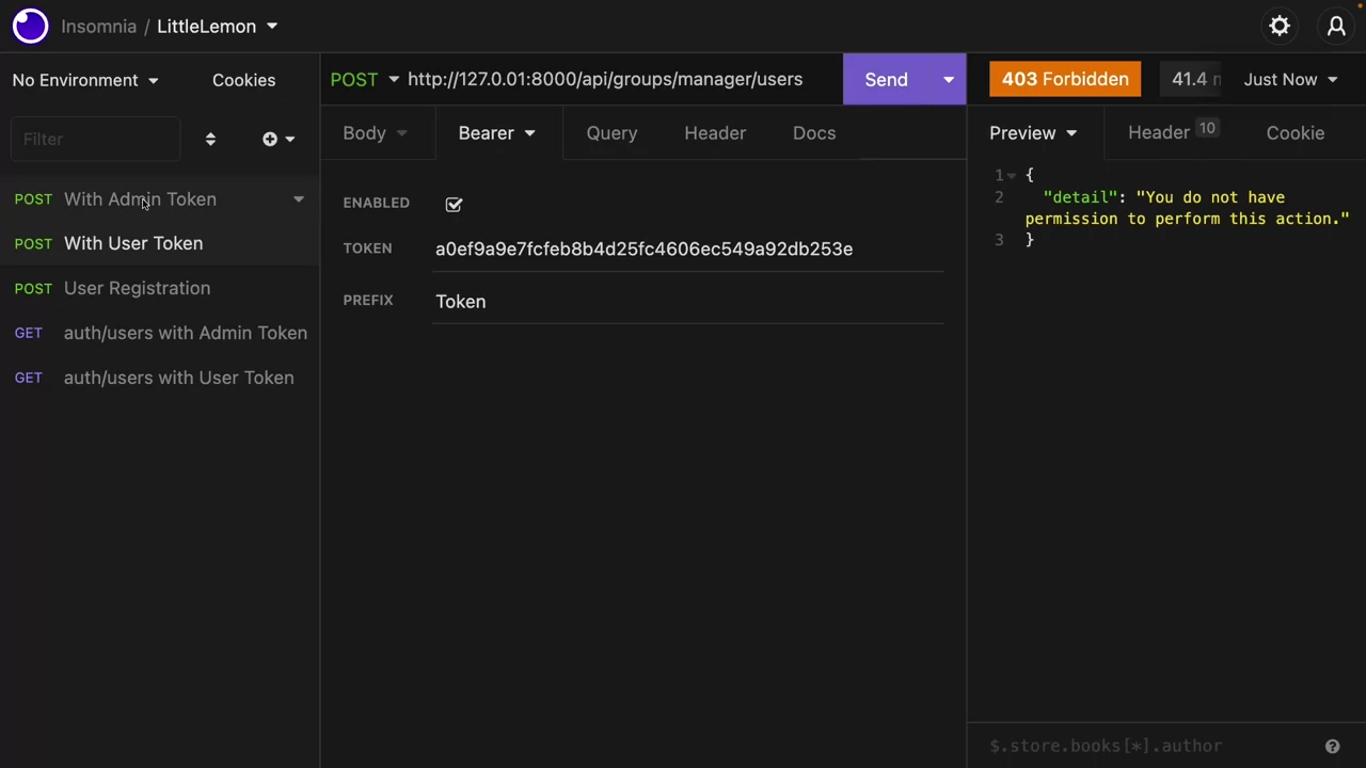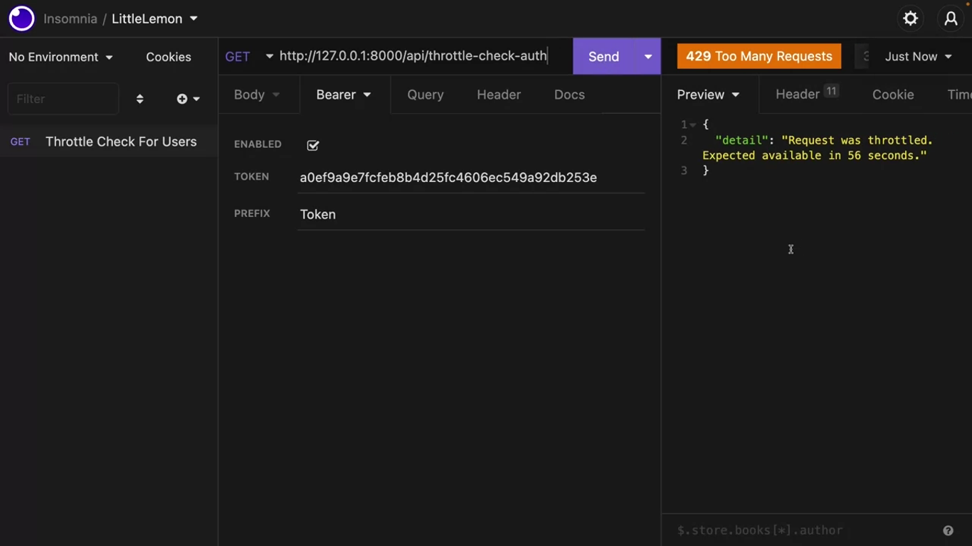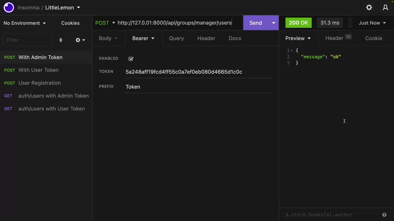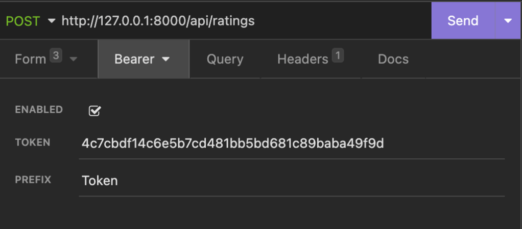 Come back to insomnia and click on the “Auth” tab next to body and select bearer token. Paste the token you just copied in the token field and right token and the prefix field.