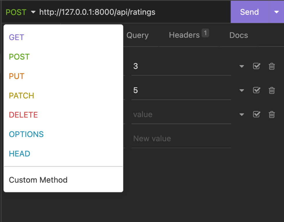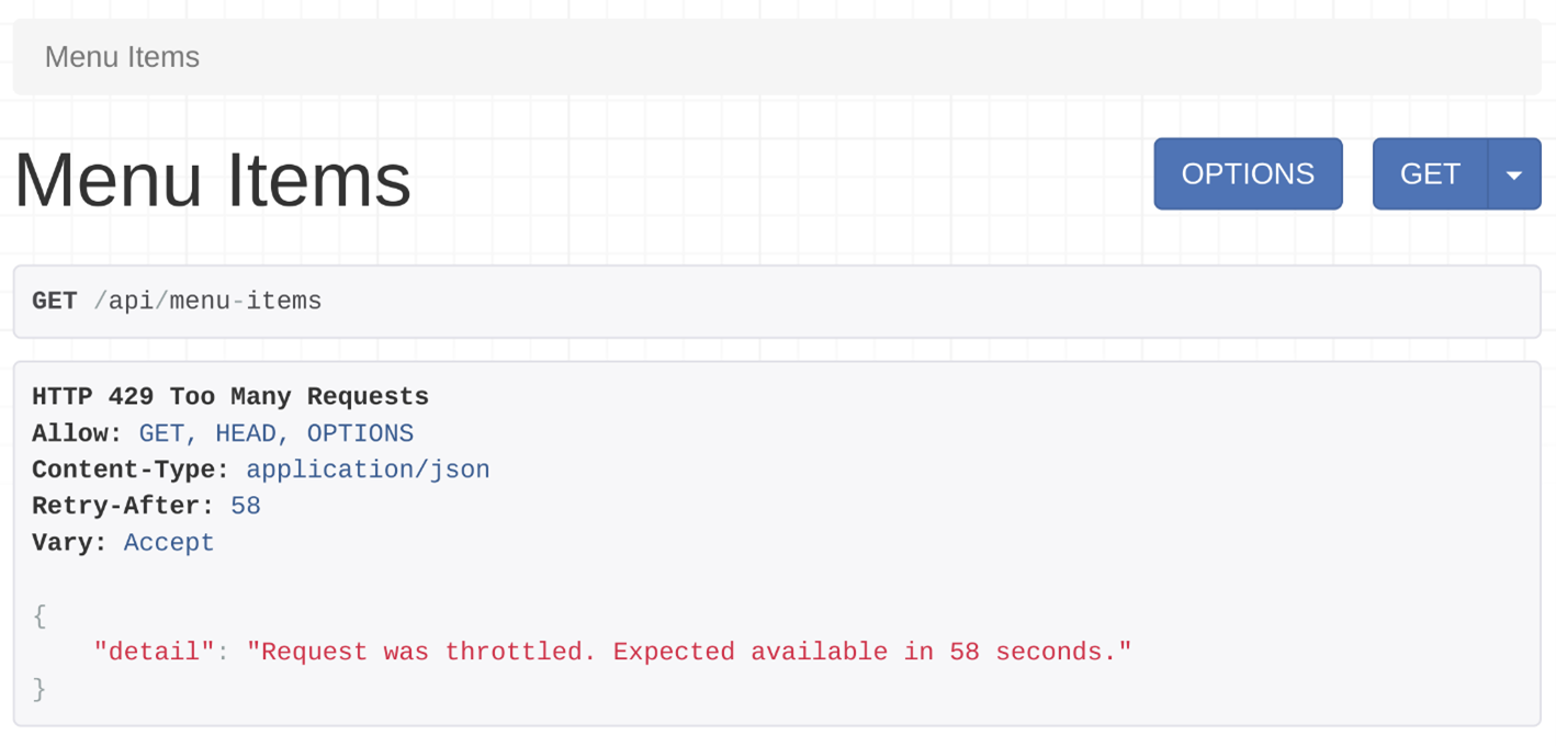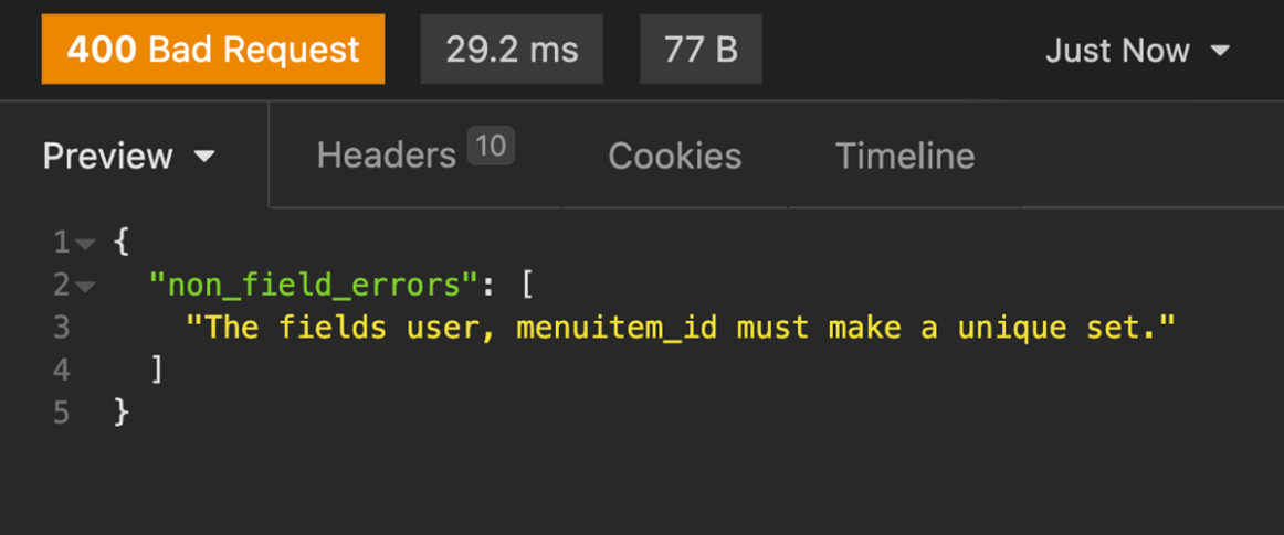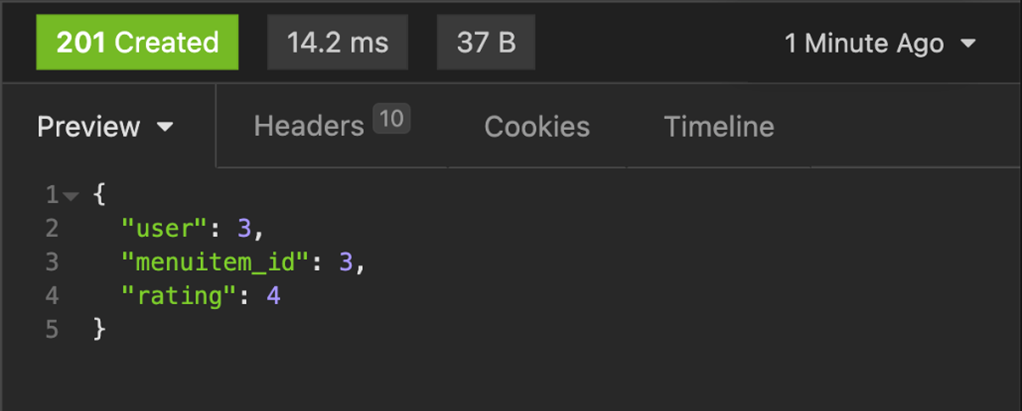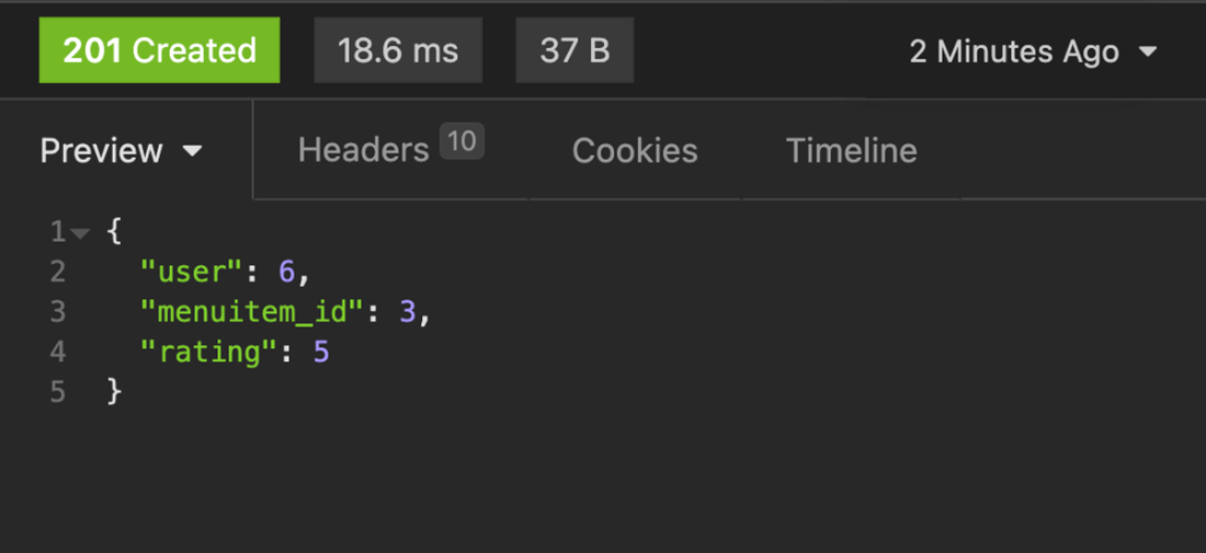 Now keep the value of menuitem_id unchanged but change the rating to 5. It should generate JSON output that is different to before, such as in the screenshot below. The error denotes the throttling limits you have placed on the number of reviews a user can add in a certain amount of time. It means that any given user can add at most one rating for a specific menu item and a unique set must be created for a combination of a user and a menu item.