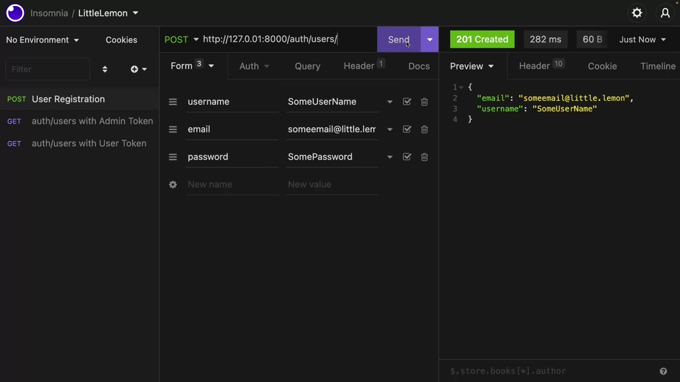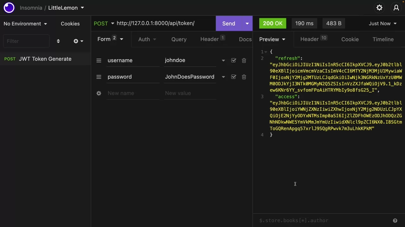 Add the username and password of a user that you created from Django admin and insomnia as form URL encoded data, and send the post request again.