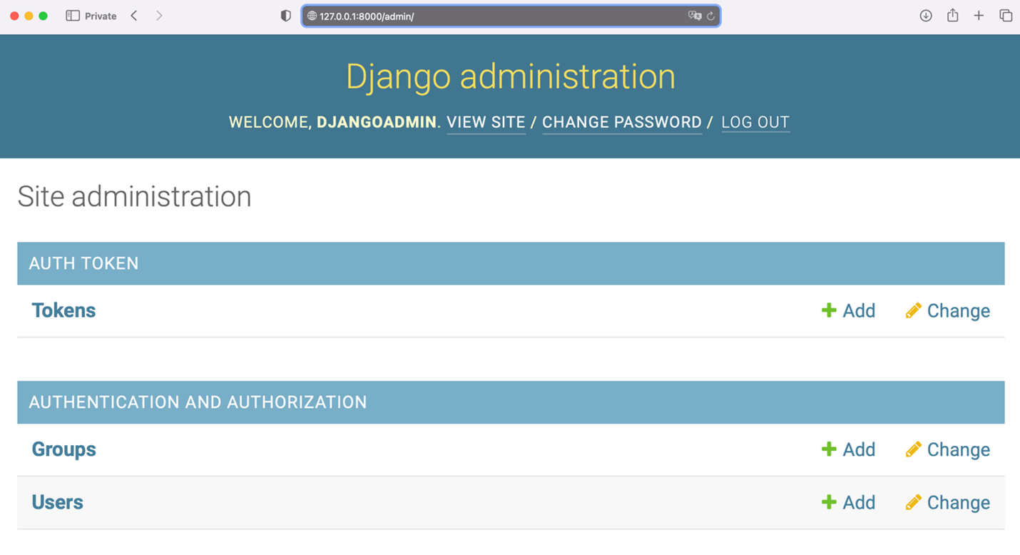 Enter the details of the credentials for the superuser you have created in step 8 and log into the Django admin panel. The Django Admin home page should appear as below: