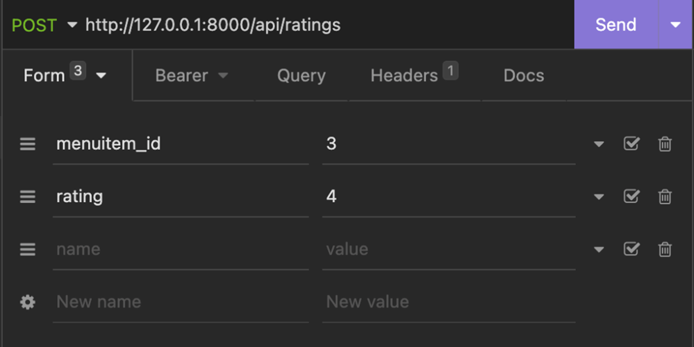 Update the token id with the user Sana and use the same values with which you encountered an error, such as menuitem_id with value 3 and a rating value of 5. This should update the user review without any issue because it is now a new rating given by another user.