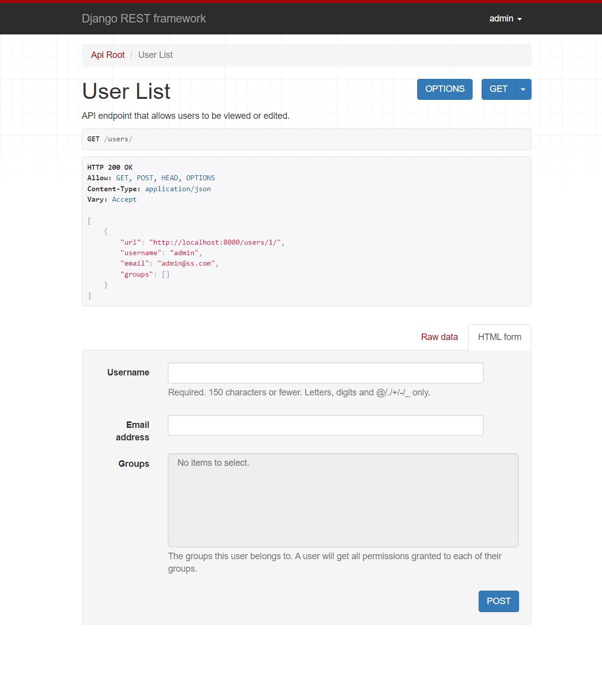 fields = ['url', 'username', 'email', 'groups']You can use the following code snippet to define views: