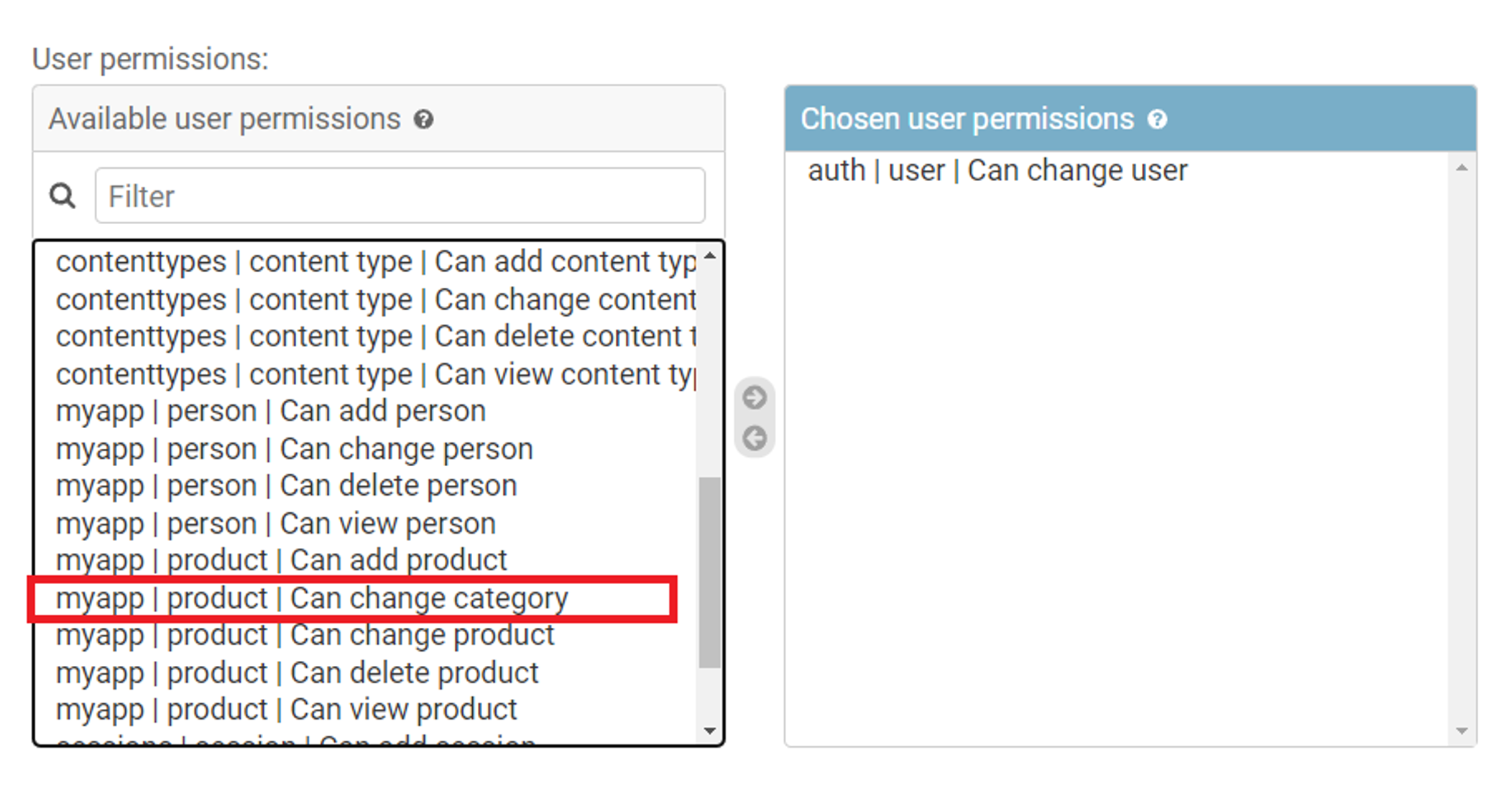 Let’s define a function testpermission(). It returns True if the user is authenticated and has a change_category permission.