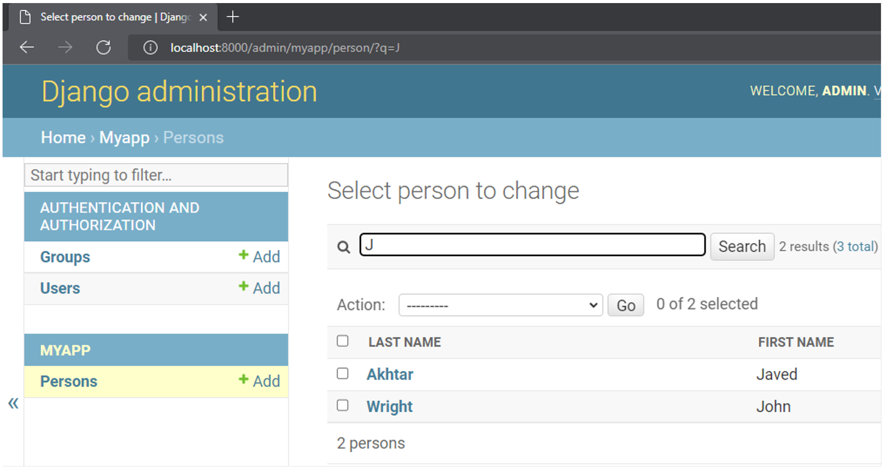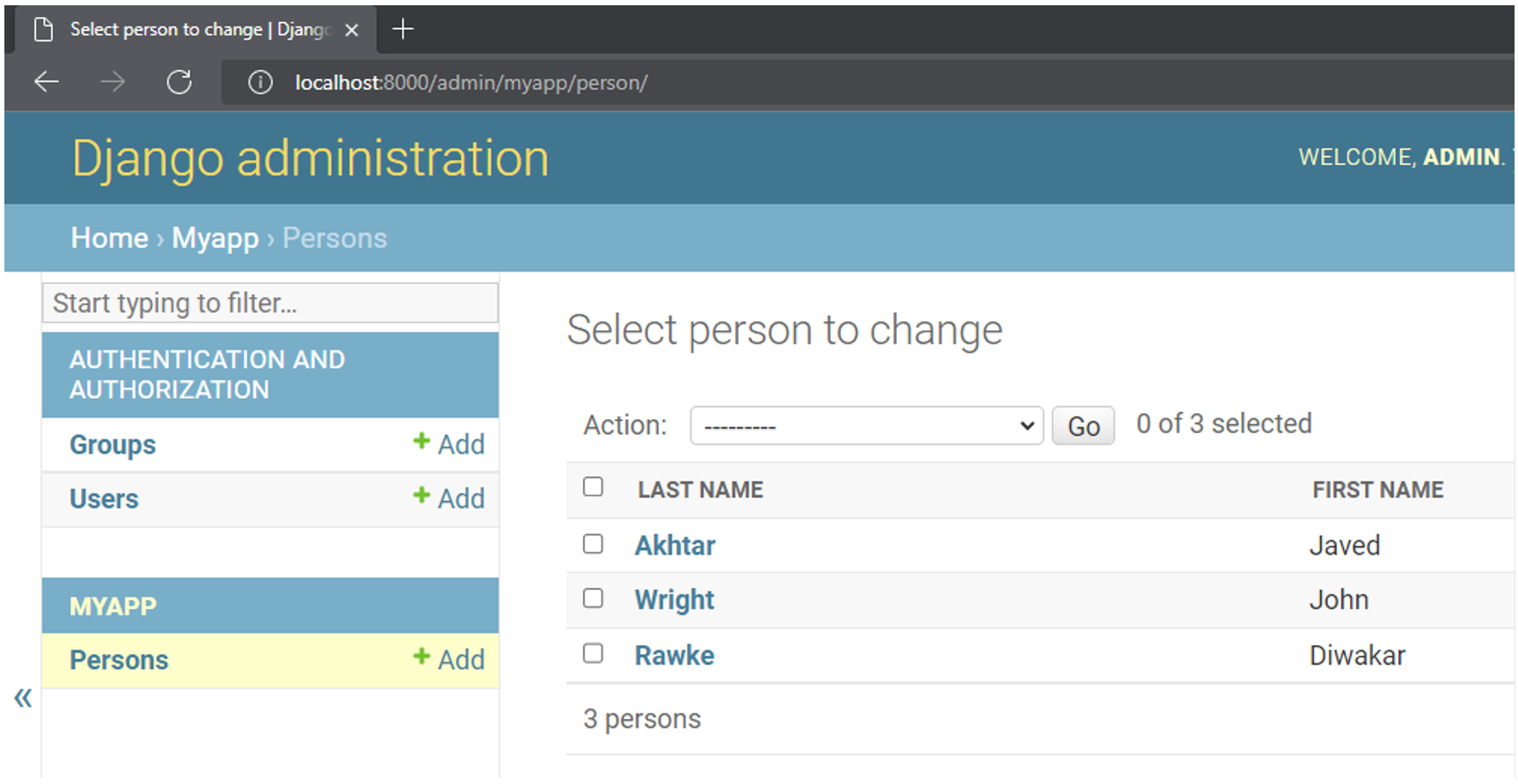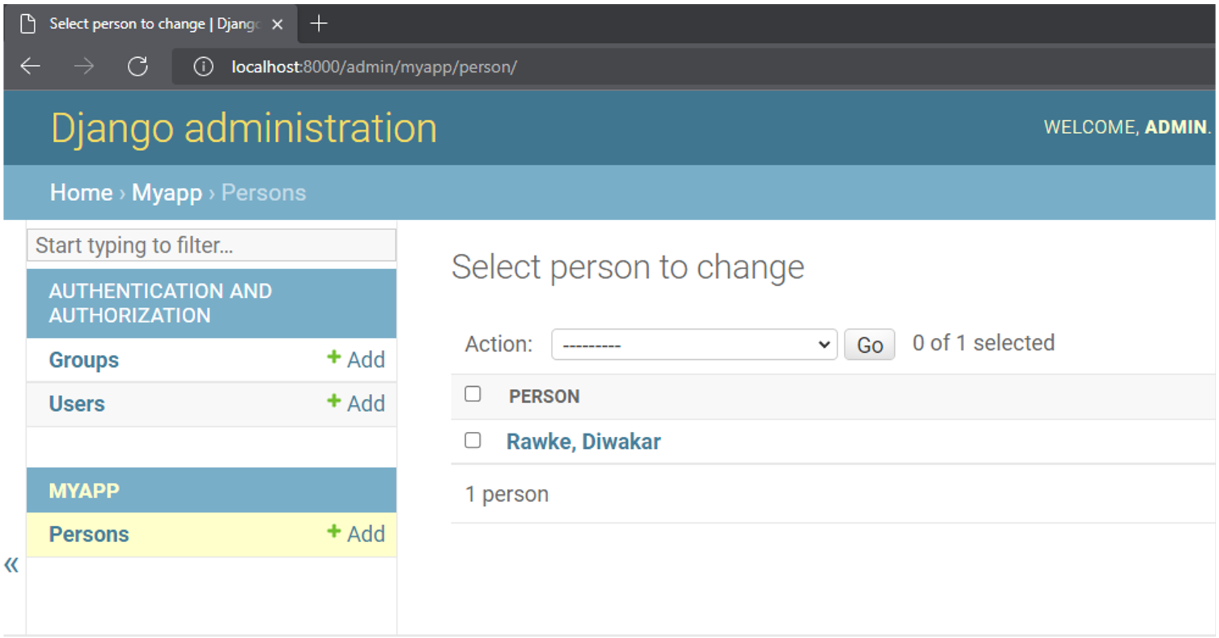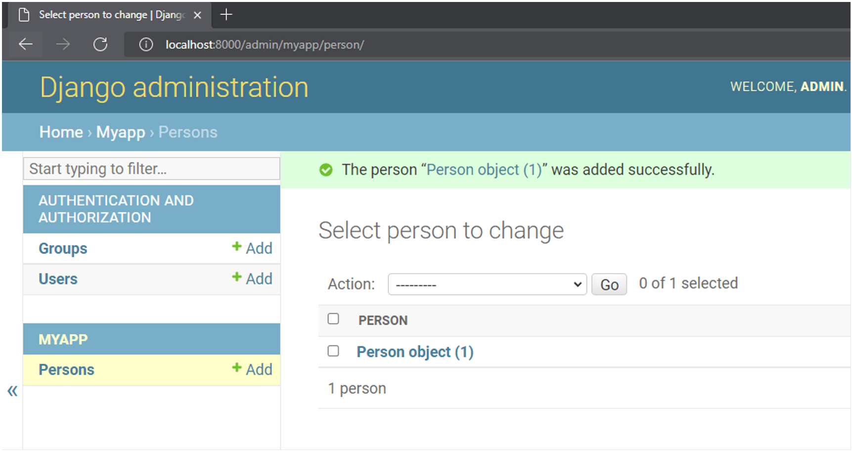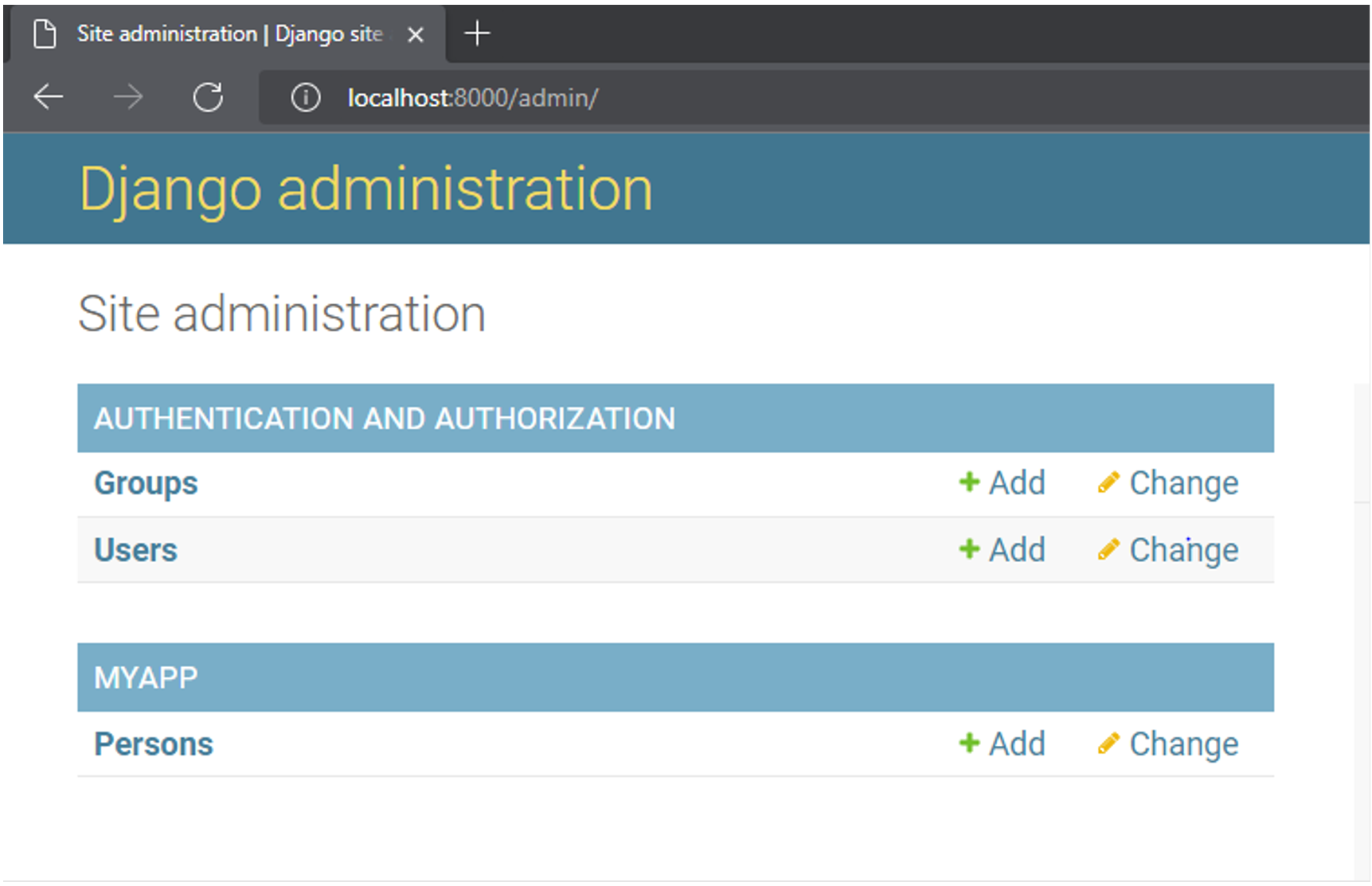 admin.site.register(Person) Log in with the super user username and password. You’ll now see the models from myapp.