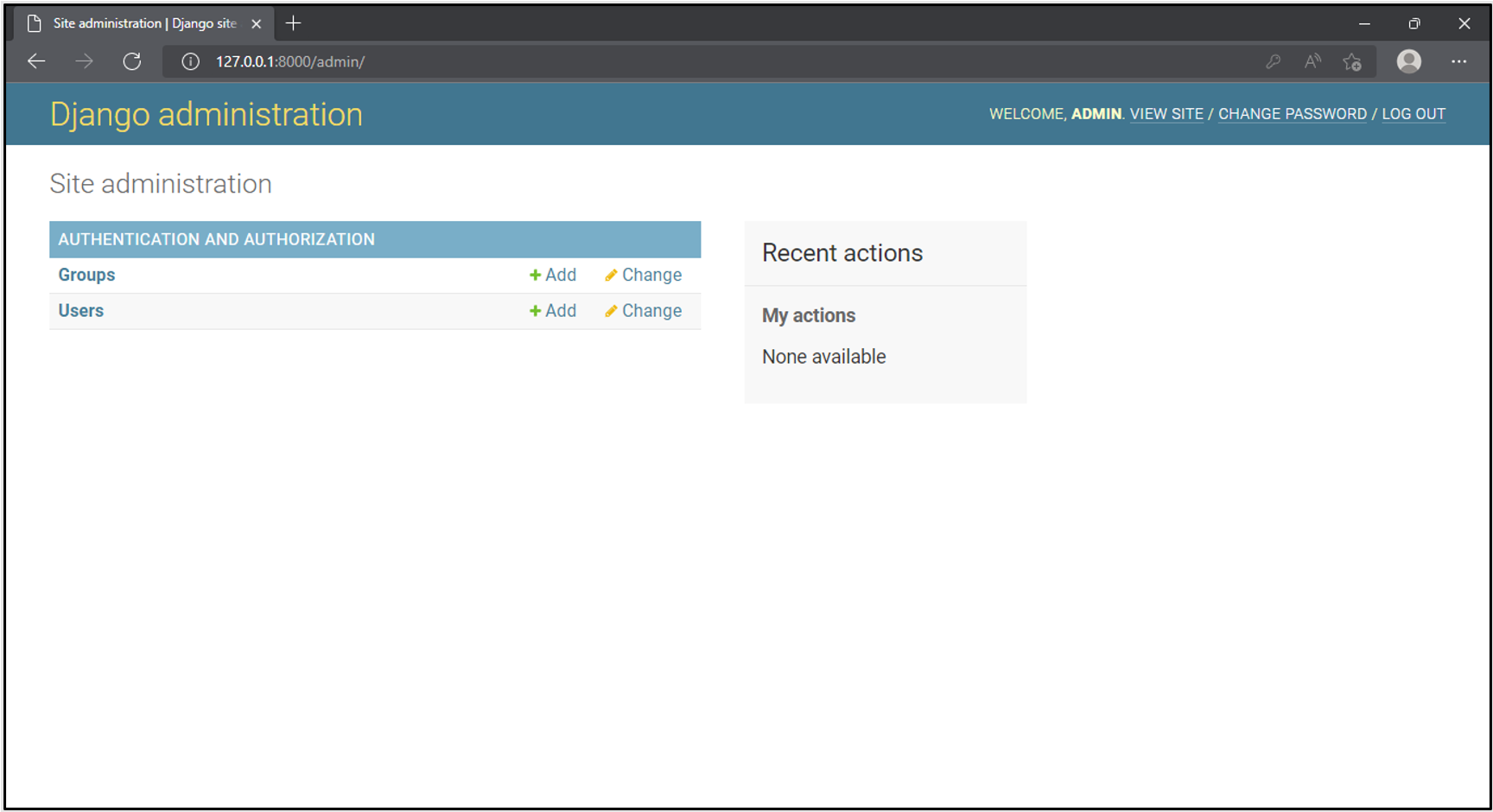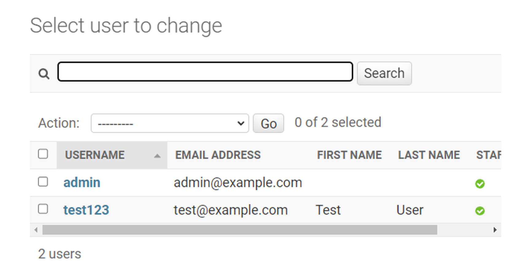 Let’s assume that the Django site has a superuser named Admin and a user named test123 with staff status enabled.