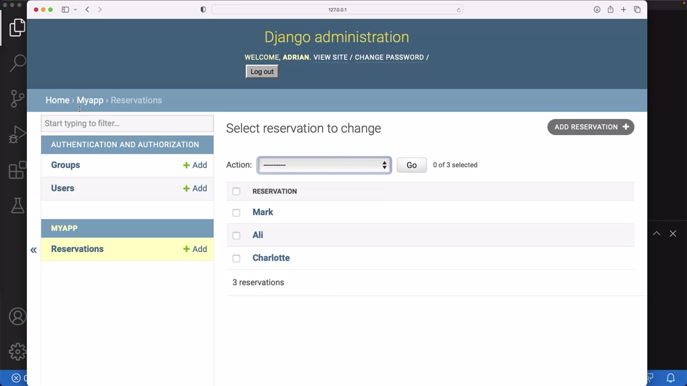 You have an option to add and change these configurations. If, let’s say you go to the reservations model and click “Change”, notice that there are a few entries listed. You have an option to directly update the reservations data using the form or add new entries. You can also delete the selected reservation by clicking the checkbox next to the names.