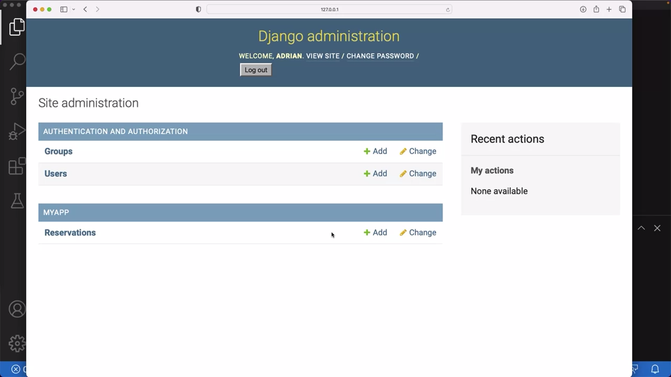 After logging in, notice that there is a basic interface. The first option gives an overview of the groups and users. There is already a sample model named reservations. Below that, there is a list of recent actions which are empty at the moment.