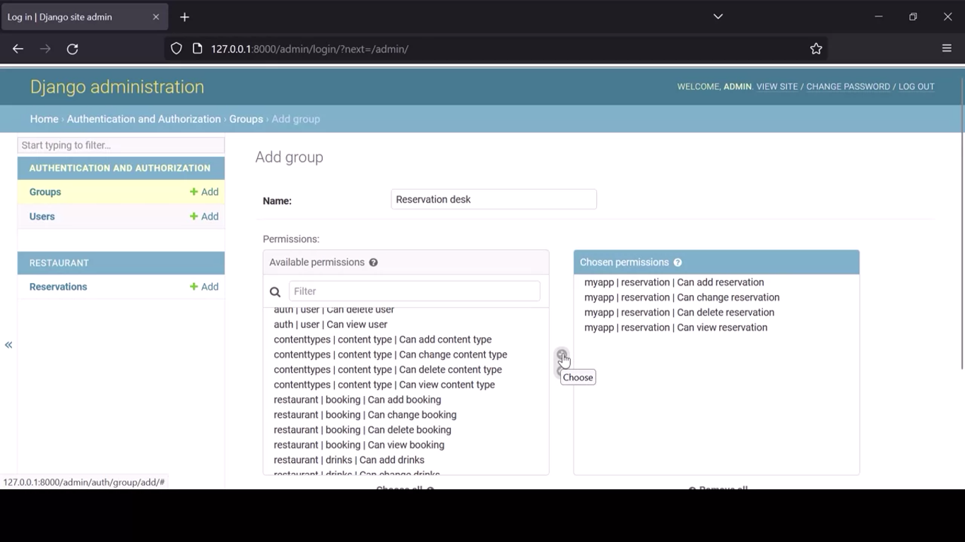 Let’s say you want to assign this group permissions for the reservations model. You can select the reservation permissions to add, change, delete or view reservations. Then click the choose button to add the permissions to the chosen permissions table.