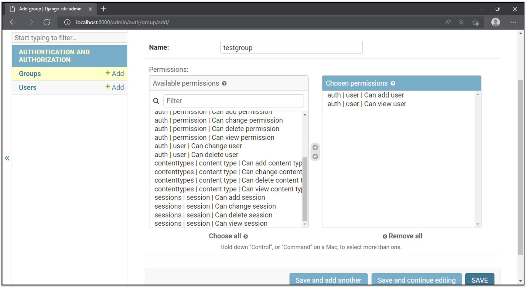 Once transferred, click the save and add another button to create the group for the website administrators.