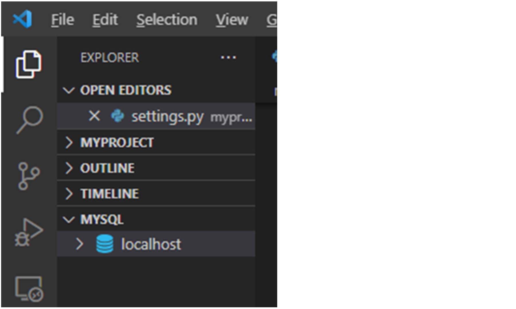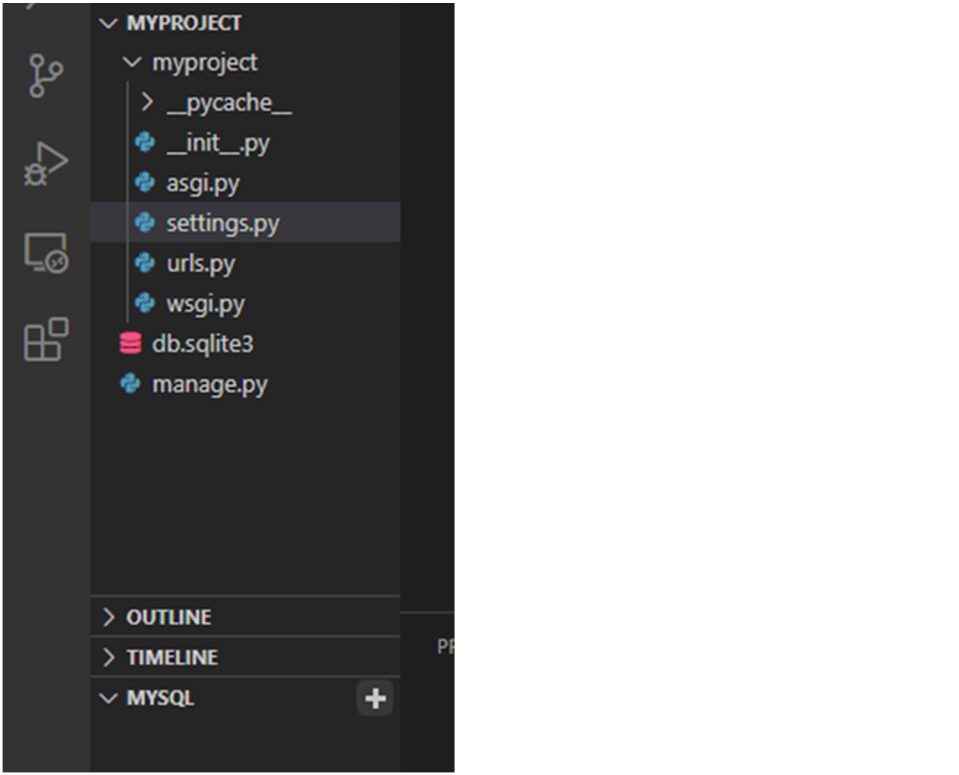 Once the database and the database connector are in place, go to the settings.py file inside the My Project folder. Here, Django will reference information about the database connection.