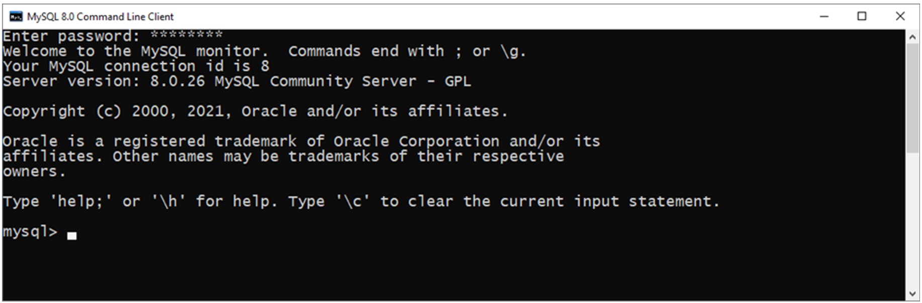 mysql -u root -pYou will be prompted to enter the password set at the time of installation. In the command terminal, you will get the MySQL prompt. You can now enter any SQL statement in it.