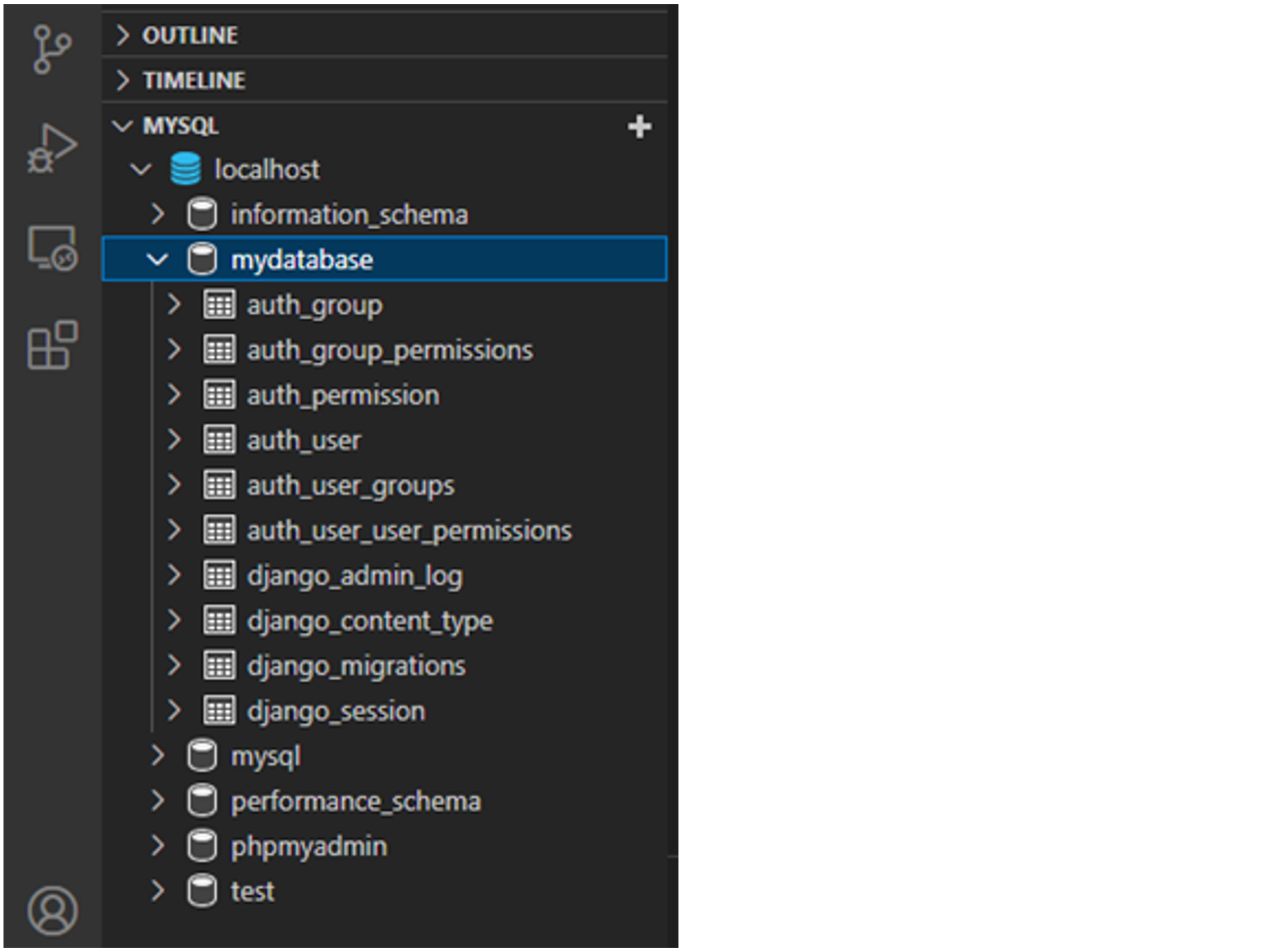 Expand the section by selecting the drop-down arrow and choose mydatabase. All the tables required for the INSTALLED_APPS will be visible.