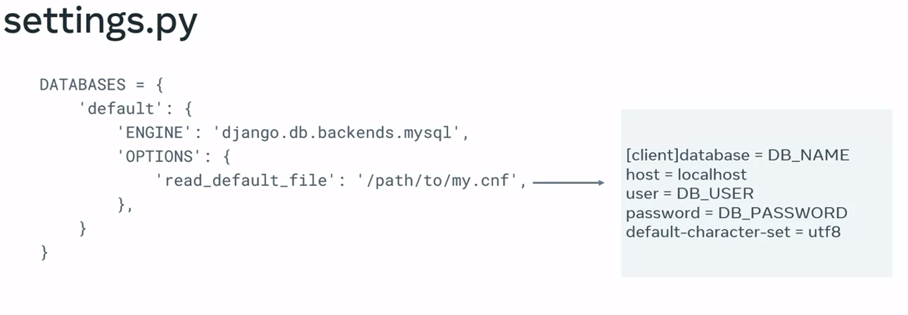 Inside the file settings.py, the MySQL connection reference looks for the connection file in the directory etc/mysql. And notice that this is not within the Django project. This is a deliberate security measure.