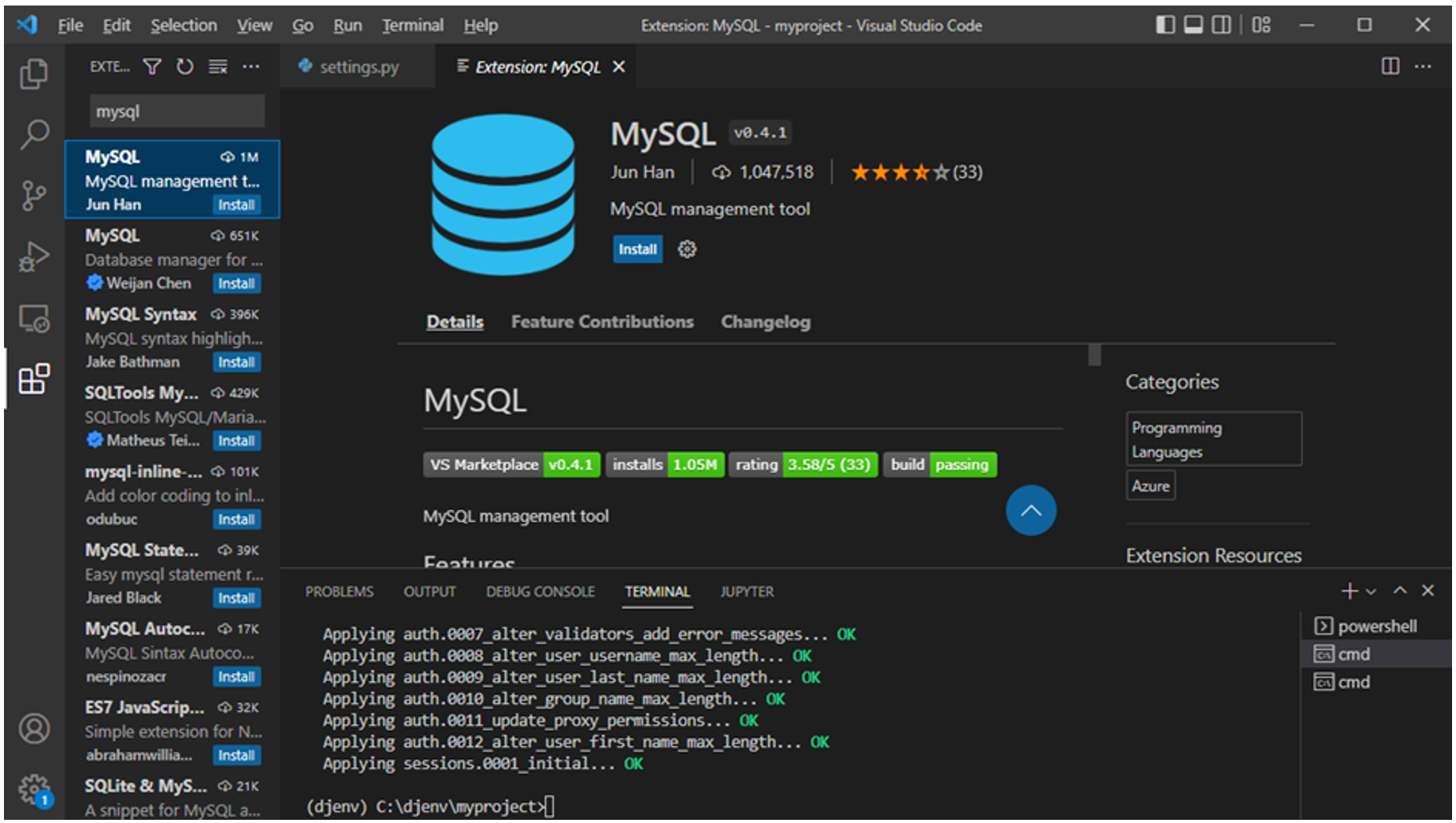 python manage.py migrateInside the MySQL terminal, run the following commands: