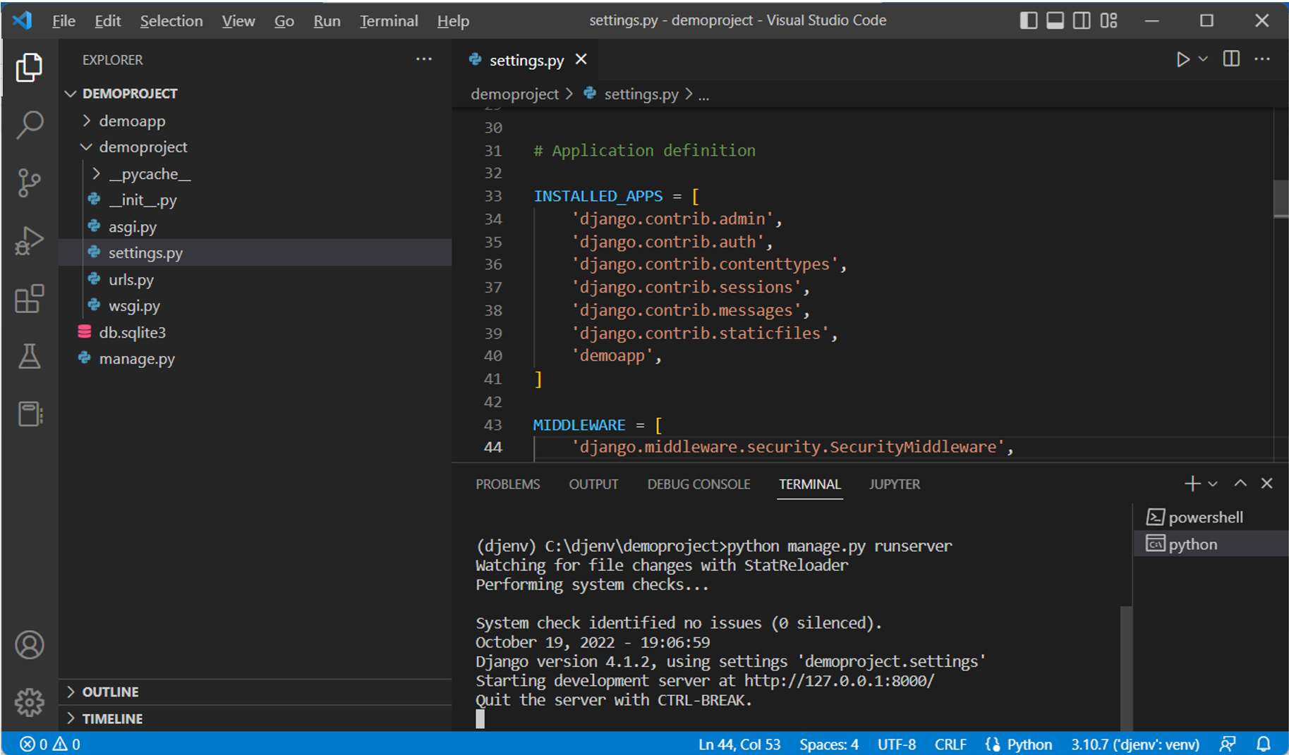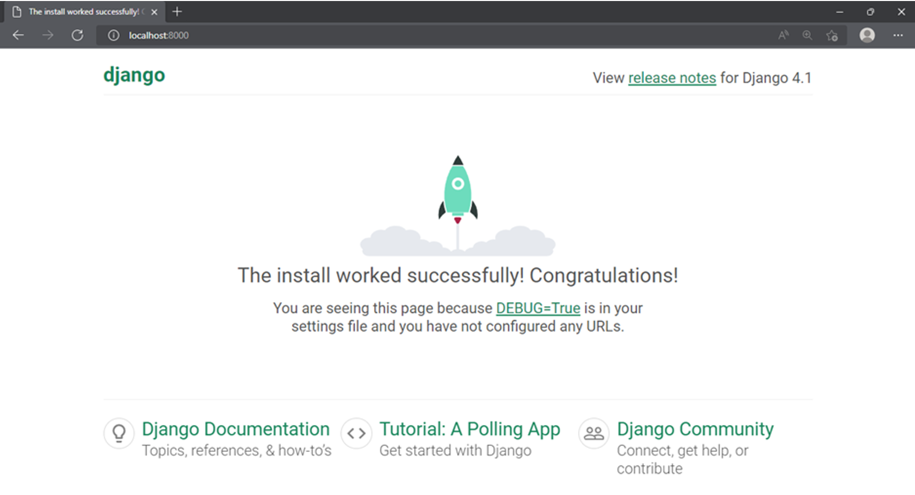 The server starts running at port 8000 of the localhost with IP address 127.0.0.1. Open the browser and enter http://127.0.0.1:8000/.