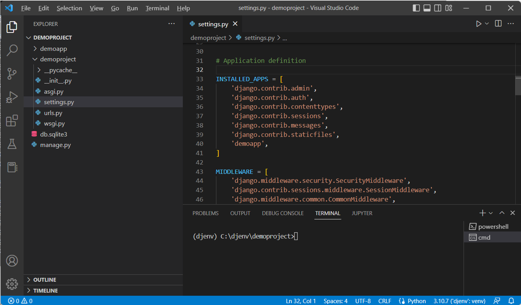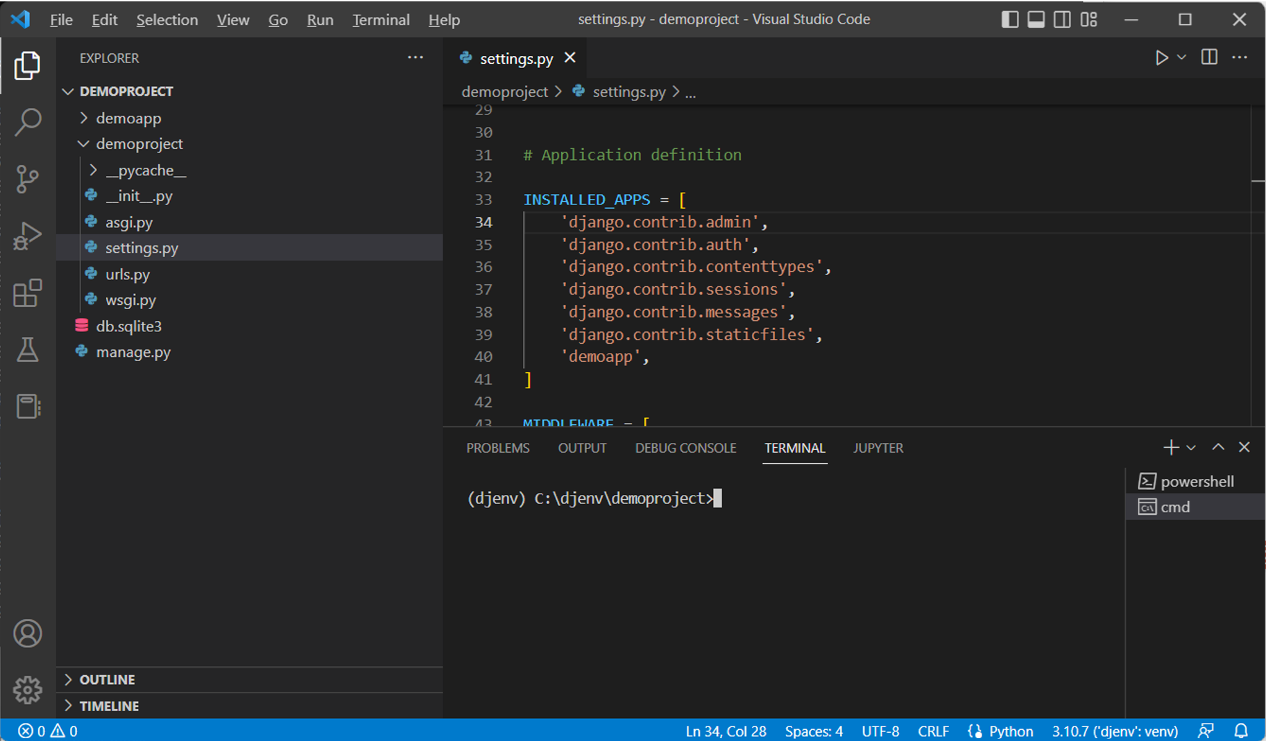 This creates a demoproject folder, inside which there’s another demoproject folder.