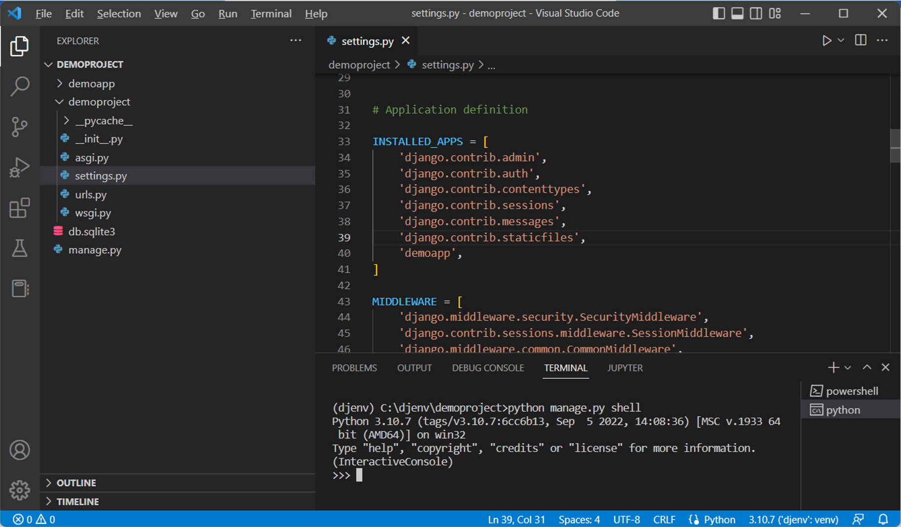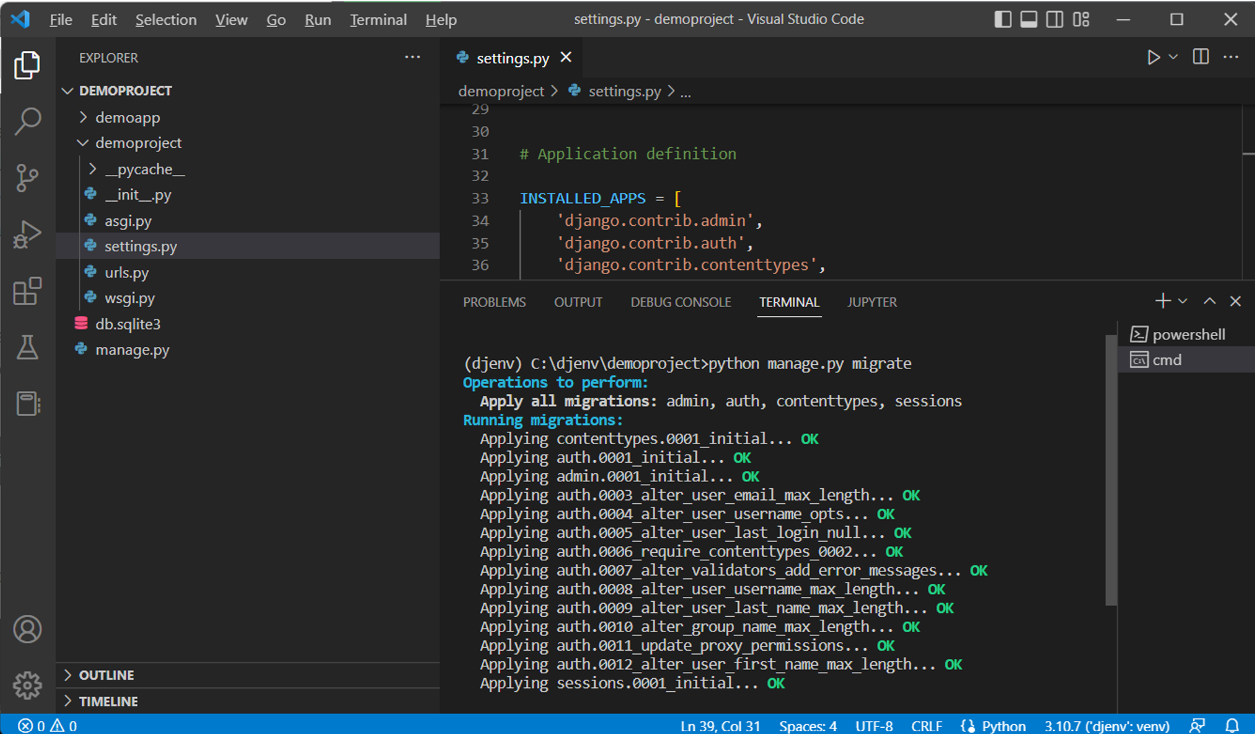 The startproject is Django’s default project template. It creates the following file structure in the Python environment: