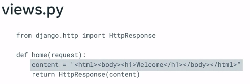 from django.http import HttpResponseNext, you define a function called home, and this is known as the view function. Each view function takes an HTTP request object as its first parameter named request.