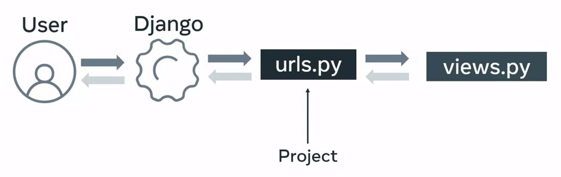 For example, in Django, when a user makes a request for a URL, this request is first handled by the urls.py file at the project level.