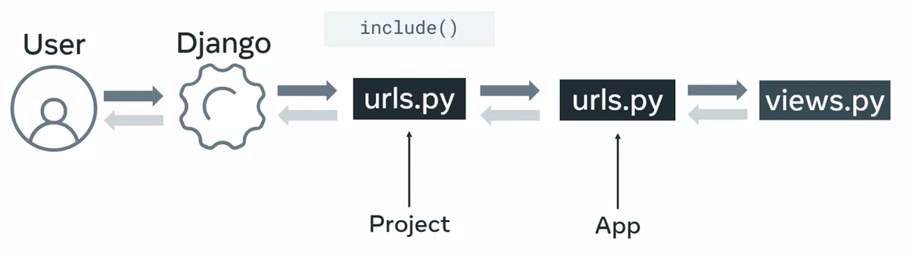 ]By using the include function, the project level urls.py can inherit the app level URL configurations.