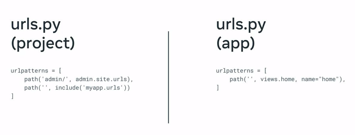 Django by default creates a urls.py file at the project level. But additionally, it’s best practice to create a urls.py at the app level. This way, the respective URLs for an app are clustered. But the project also needs to know what URLs are used inside each app.