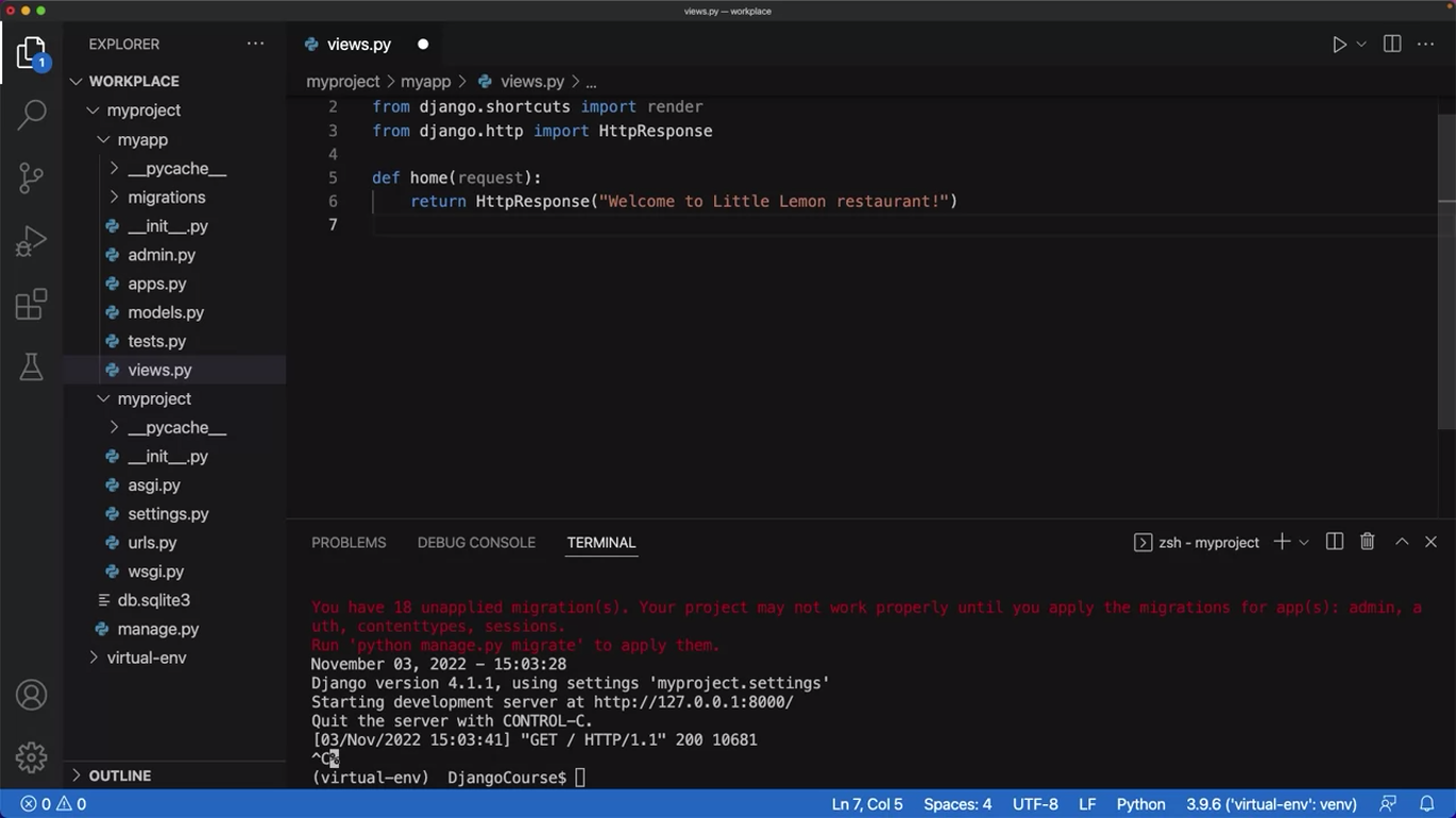 return HttpResponse("Welcome to Little Lemon!")# urls.py (project level)