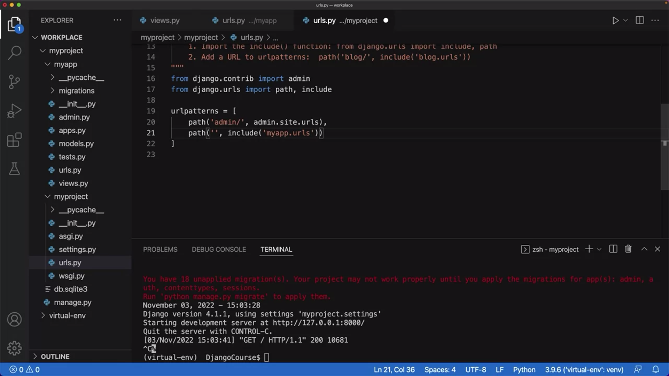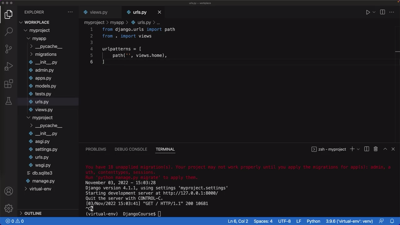 Because the file’s urls.py file and views.py file are in the same folder, you only need to provide the name of the file without the.py extension where the view function is located, and then a dot and the name of the view function. Notice that VS Code highlights the word views in the code. This means that in order to use the views.py file, it must be imported.