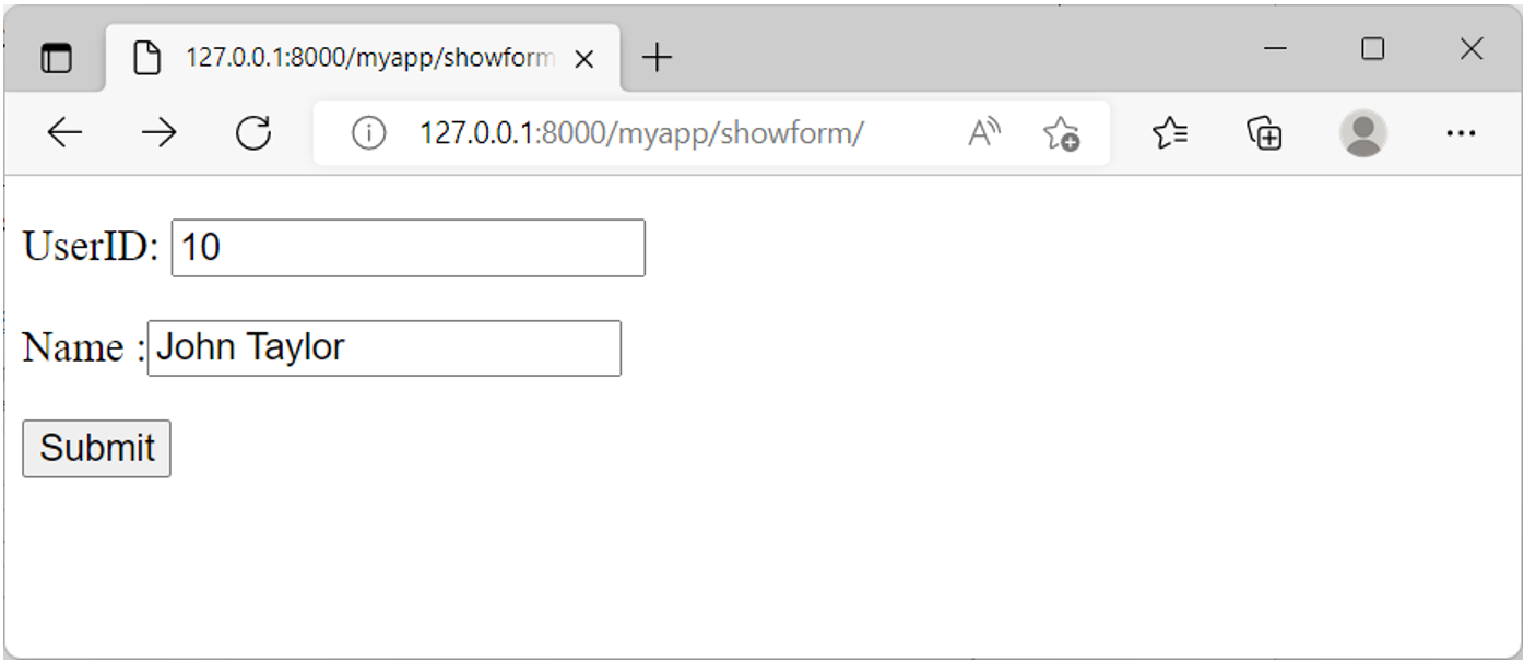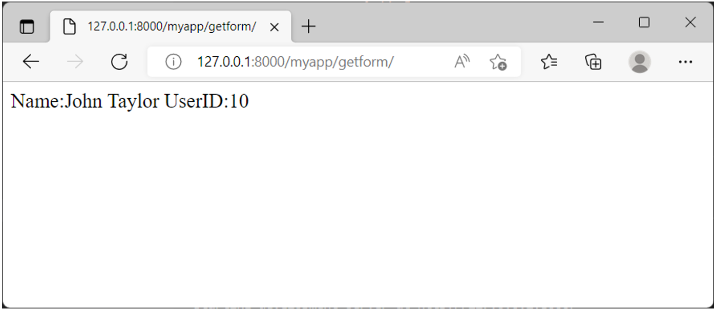 return HttpResponse("Name:{} UserID:{}".format(name, id)) Complete the form and submit it. The getform() function returns the data as its response.