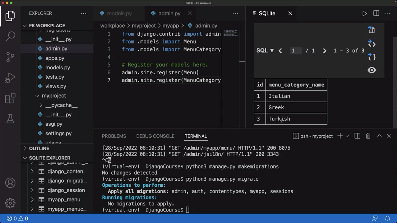 The failed category on the menu is altered. Notice that with on_delete=models.PROTECT selected, no menu items will be removed with any category that is deleted in the category table.
