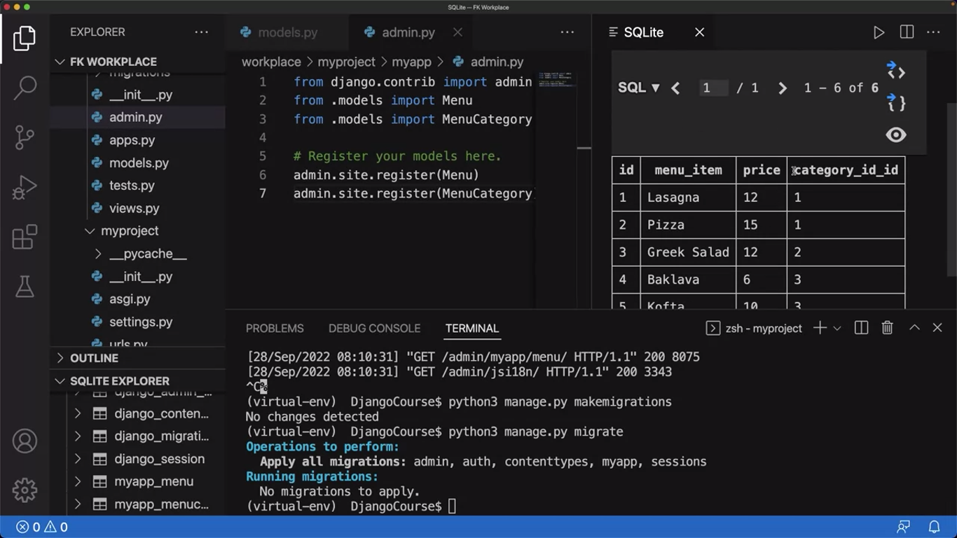 The next step is to check the database. So go to db.sqlite3, Right Click and select Open Database, scroll down to SQLITE EXPLORER and select myapp_menu. For this example, assume that there are entries added to the database.