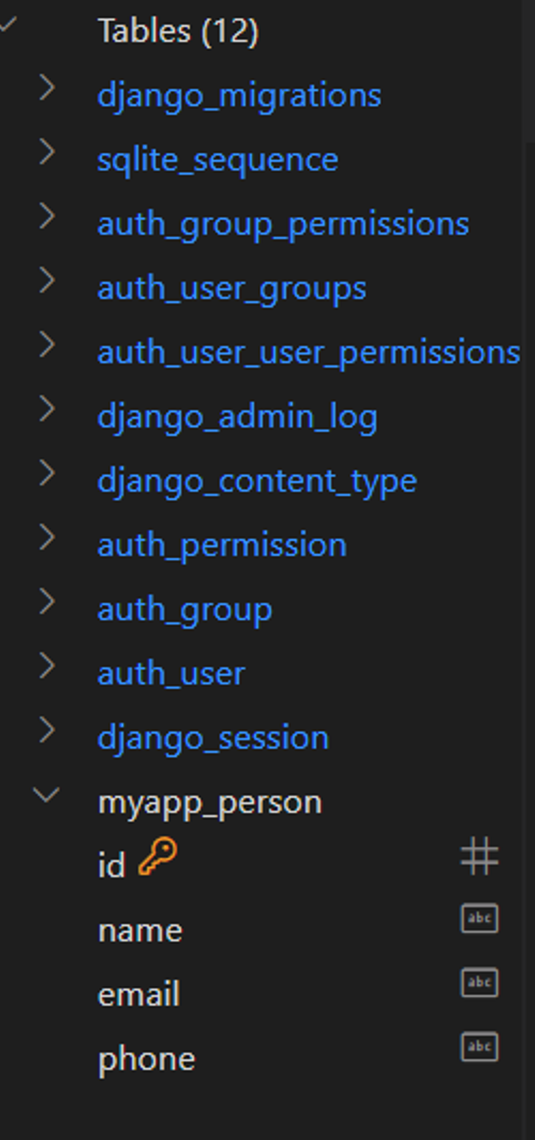 email = models.EmailField(max_length=50) When you run a migration on these models, respective tables are created with equivalent SQL queries: