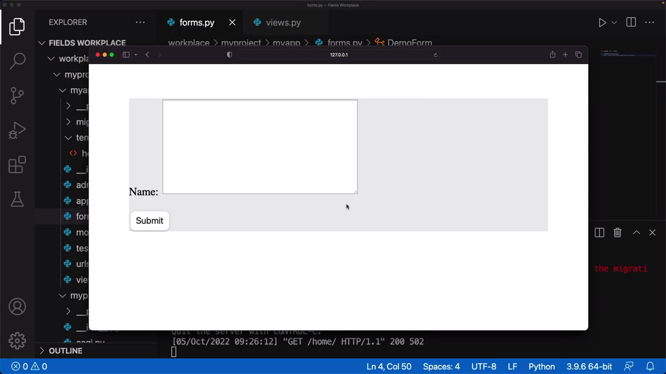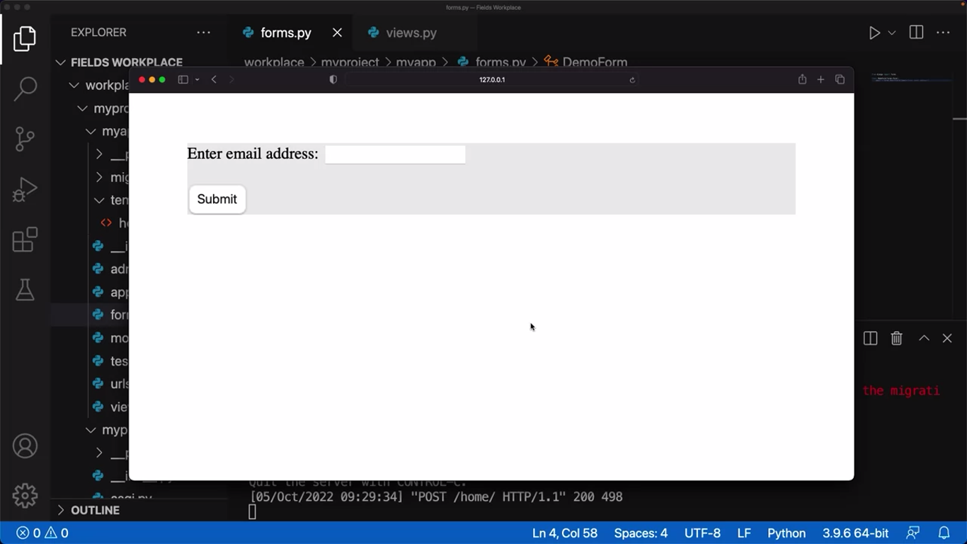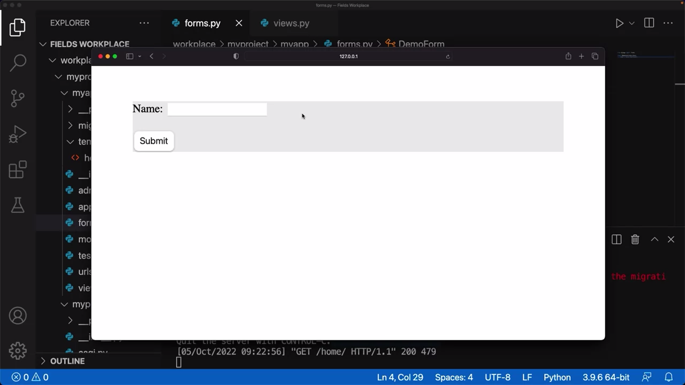 Just as a reminder, notice the code in the forms.py file and how it is used to render a form in the browser.