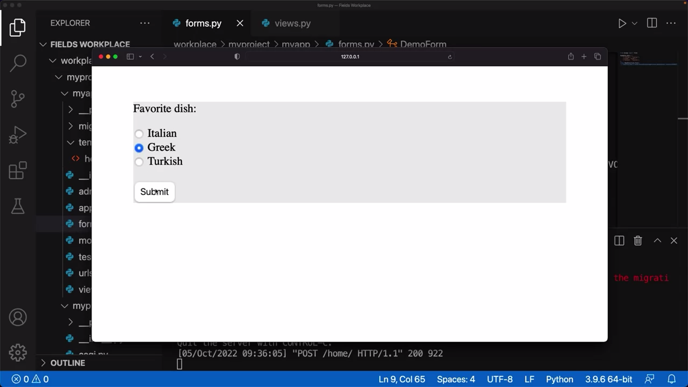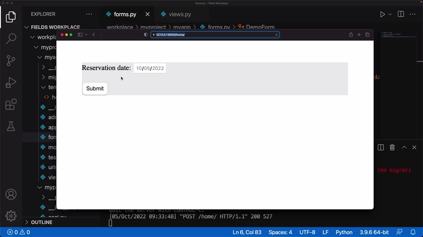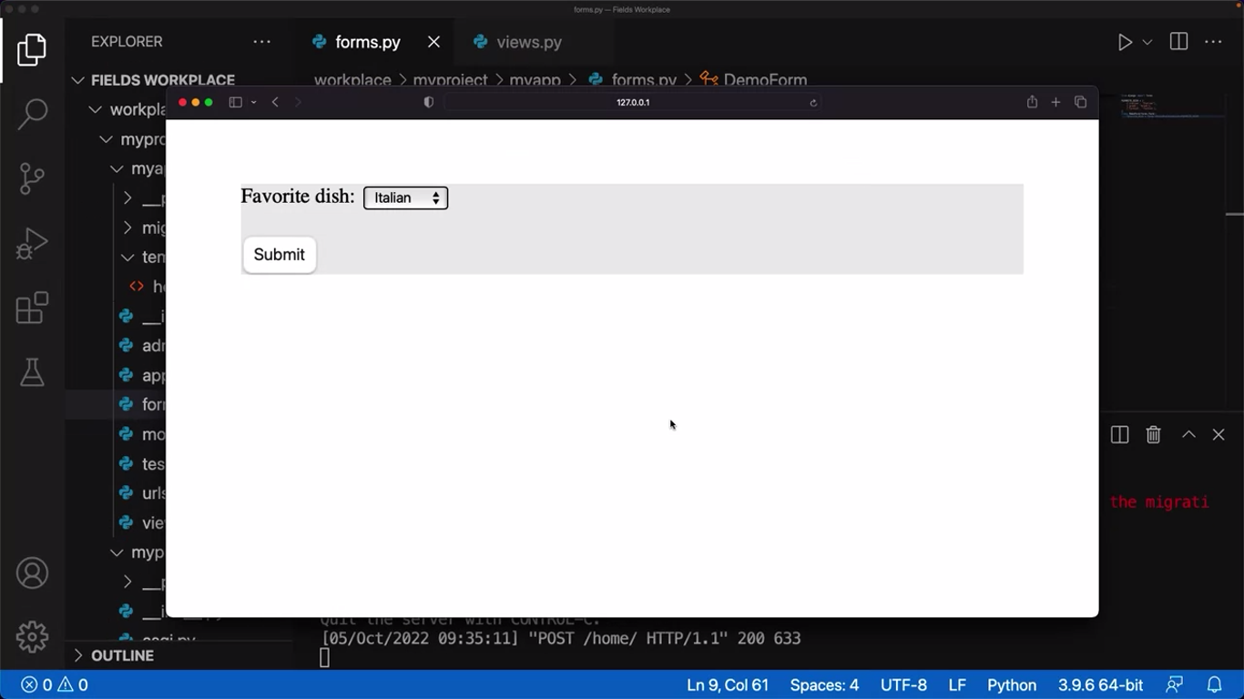 Just as a reminder, notice the code in the forms.py file and how it is used to render a form in the browser.