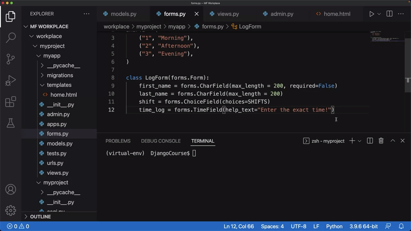 time_log = models.TimeField(help_text="Enter the exact time")Next, let’s go to forms.py again, delete the existing content and then create the ModelForm based on the model that is in place.