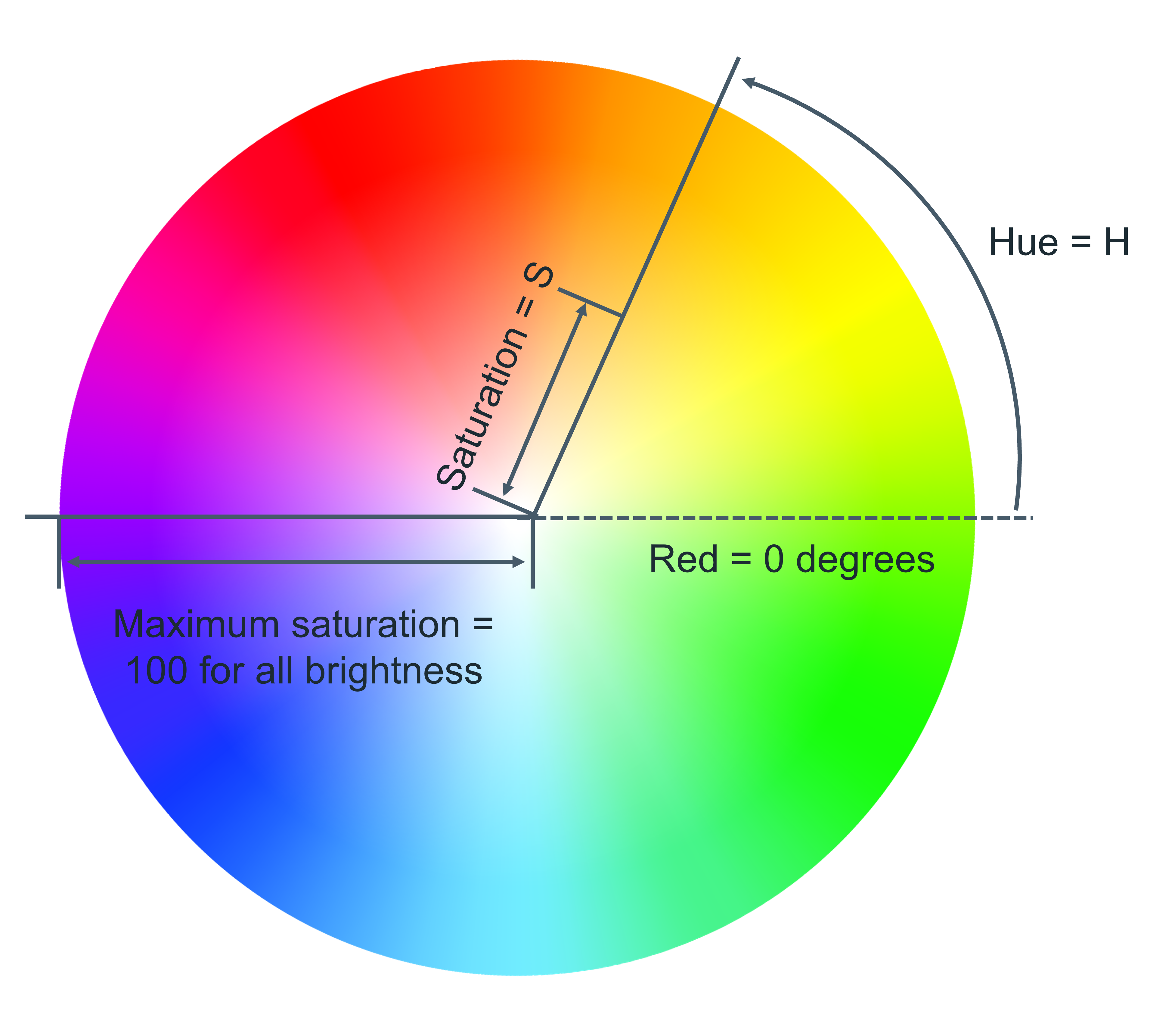 Think of a rainbow that has been turned into a full circle. This represents the Hue. The Hue value is the degree value on this circle, from 0 degrees to 360 degrees. 0 is red, 120 is green and 240 is blue.