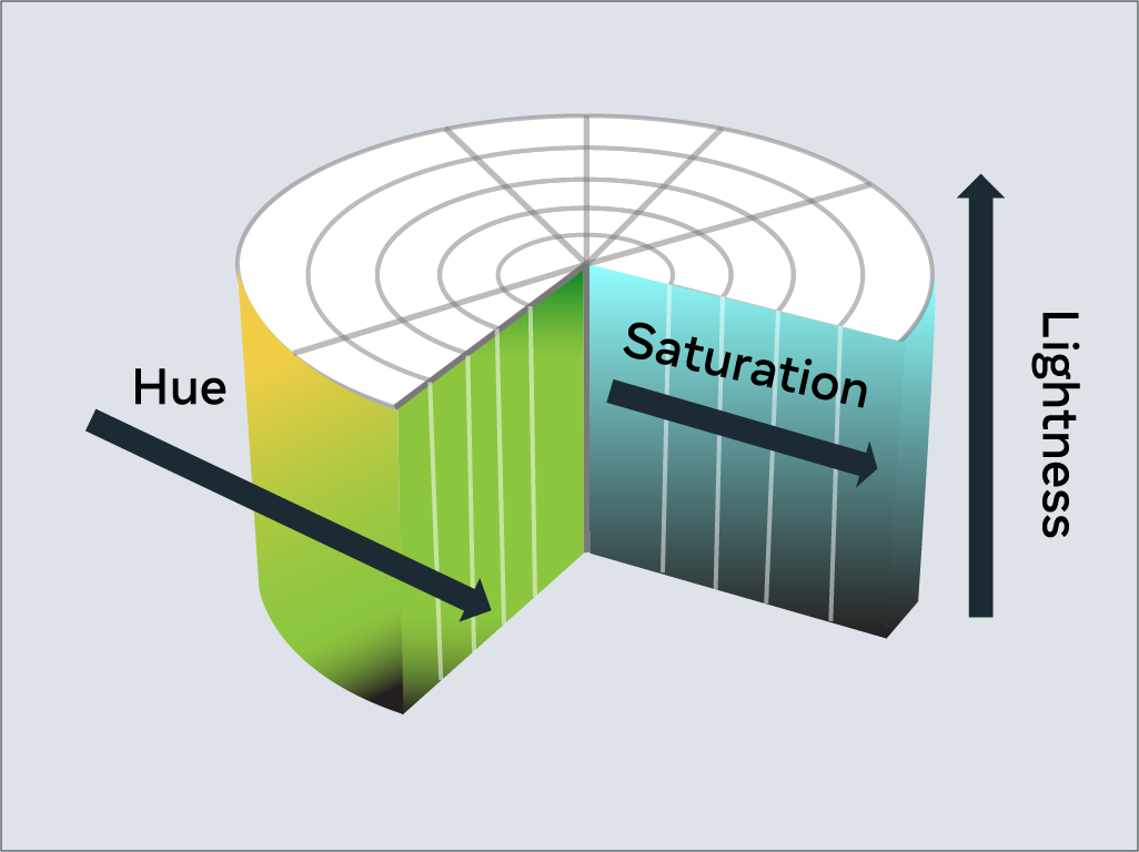Lightness is the third element of this color model. Think of it as turning the circle into a 3D cylinder where the bottom of the cylinder is more black and toward the top is more white. Therefore, lightness is the distance from the bottom of the cylinder to the top. Again, lightness is represented by a percentage from 0% to 100% where 0% is the bottom of the cylinder and 100% is its top. In other words, 0% will mean that the color is more black and 100% is white.