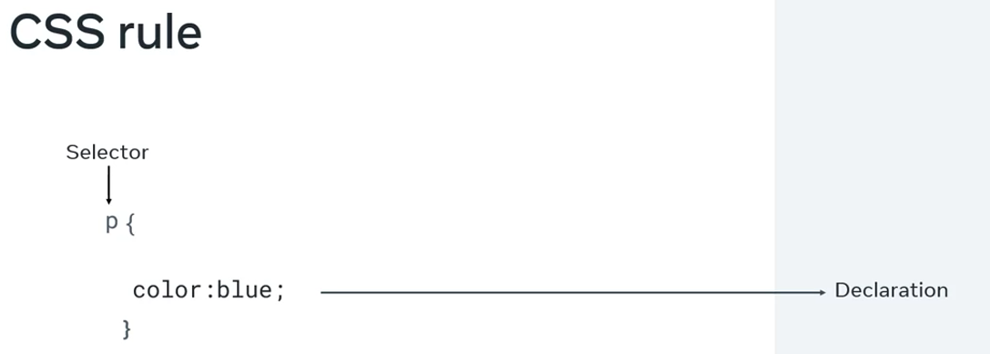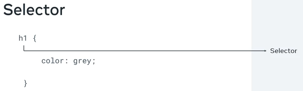 The first element of the CSS rule is the selector. This indicates which html element or elements we want to style. For example, you can create a rule that uses the h1 selector to change the color of all heading one tags in a web page to gray.