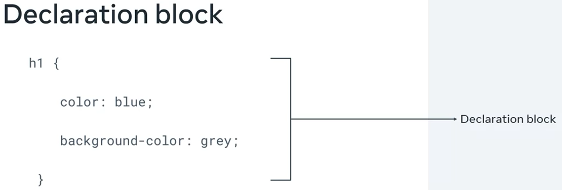 Then you make a declaration block using curly brackets. It holds information about the properties and values.
