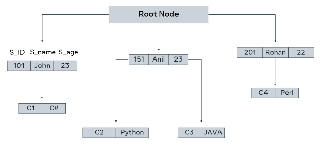 Below is an example of how data is stored in a hierarchical database. In this case, it is data on college students who are taking different courses. A course can be assigned to only a single student, but a student can take as many courses as they want. Thus, there is a one-to-many relationship.Â