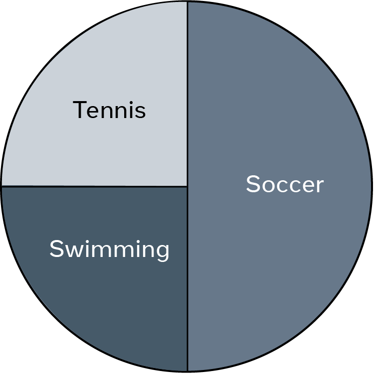 If you ask someone looking at this chart about the percentage of students who like soccer, their answer will be 50%, as it is the slice’s size that helps them to identify the percentage. In this case, “Soccer” occupies half of the pie and, therefore, it is 50% of the whole. “Tennis” and “Swimming” represent the other half of the pie. Since they are equals, each is a quarter of the pie, which is 25% of the whole.Â